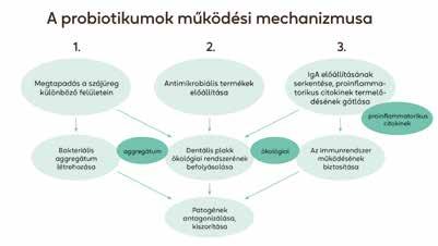 Az első és legfontosabb a probiotikumnak minősülő baktériumok kolonizációs képessége. A jótékony törzsek bakteriális aggregátumot hoznak létre, ezáltal gátolják a többi, esetlegesen káros mikroorganizmus megtapadását a szájüreg különböző felületein. Azáltal, hogy versenyeznek a táplálékért és a növekedési faktorokért, nagyban befolyásolják a dentális plakk ökológiai rendszerét. Ezen felül képesek különféle fehérjék termelésével antagonizálni egyes orális patogének működését [3]. A jótékony baktériumoknak fontos szerepük van a megfelelő immunválasz kialakulásában és az IgA-termelés serkentésében. Gátolják a patogének által szekretált proinflammatorikus citokinek termelődését, csökkentik a Mátrix Metallo Proteáz (MMP) termelődését. A fentiek eredményeképpen