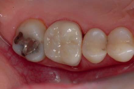 5: The finalised all-zirconia crown (BruxZir, Glidewell Europe GmbH) was stained, glaze-fired, and then adhesively bonded using a resin cement system (ResiCem, Shofu Dental GmbH)