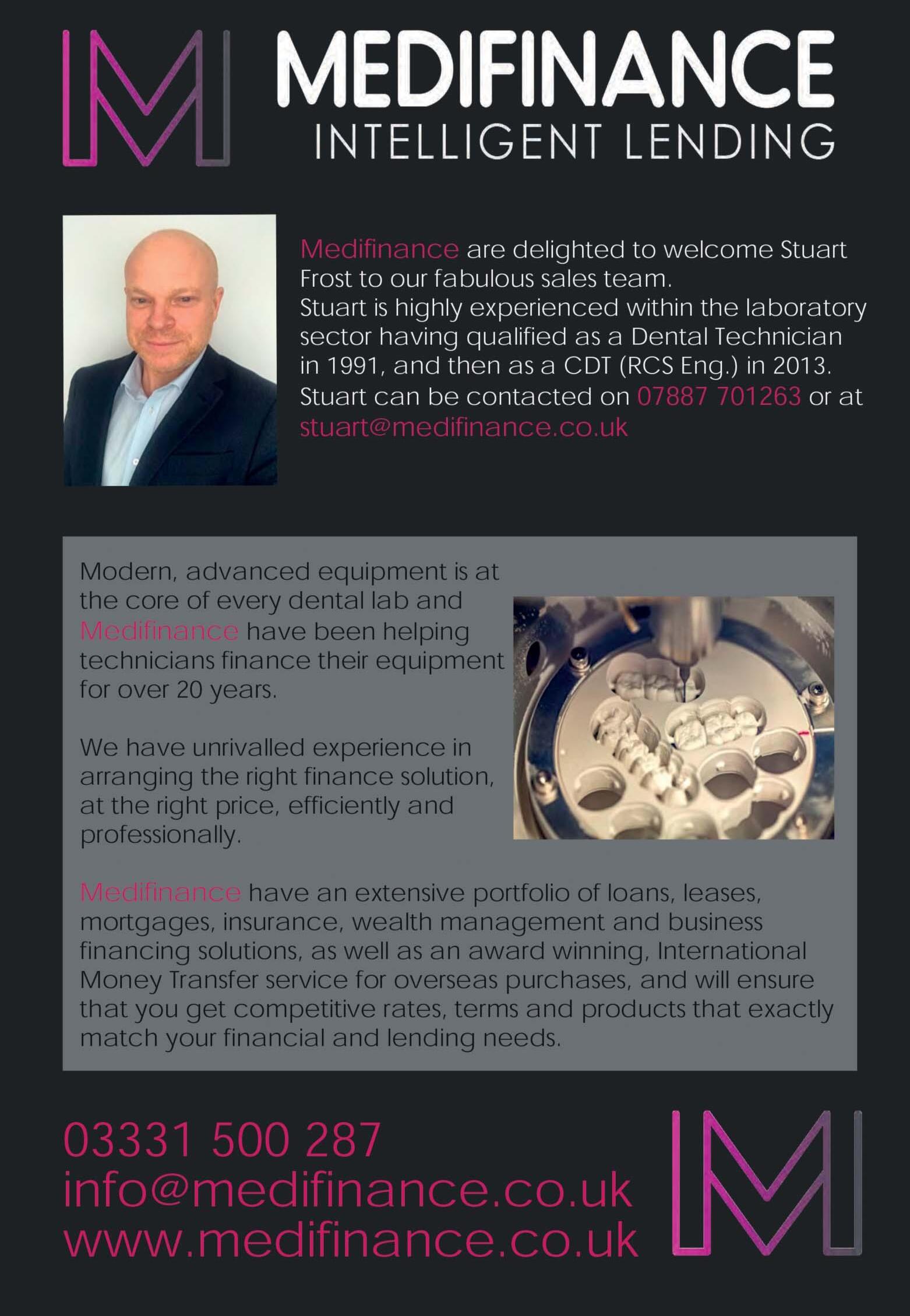 Medifinance, experts in providing financial solutions to the dental laboratory sector, have recently brought Stuart Frost into the sales team as Head of Laboratory Finance. ‘I am really excited to have joined the fabulous team at Medifinance. Their experience is second to none and with my years of involvement in dental technology, dentistry, and the financial markets, I consider myself perfectly placed to help dental technicians, lab owners and CDTs with a host of financial solutions’ said Stuart.