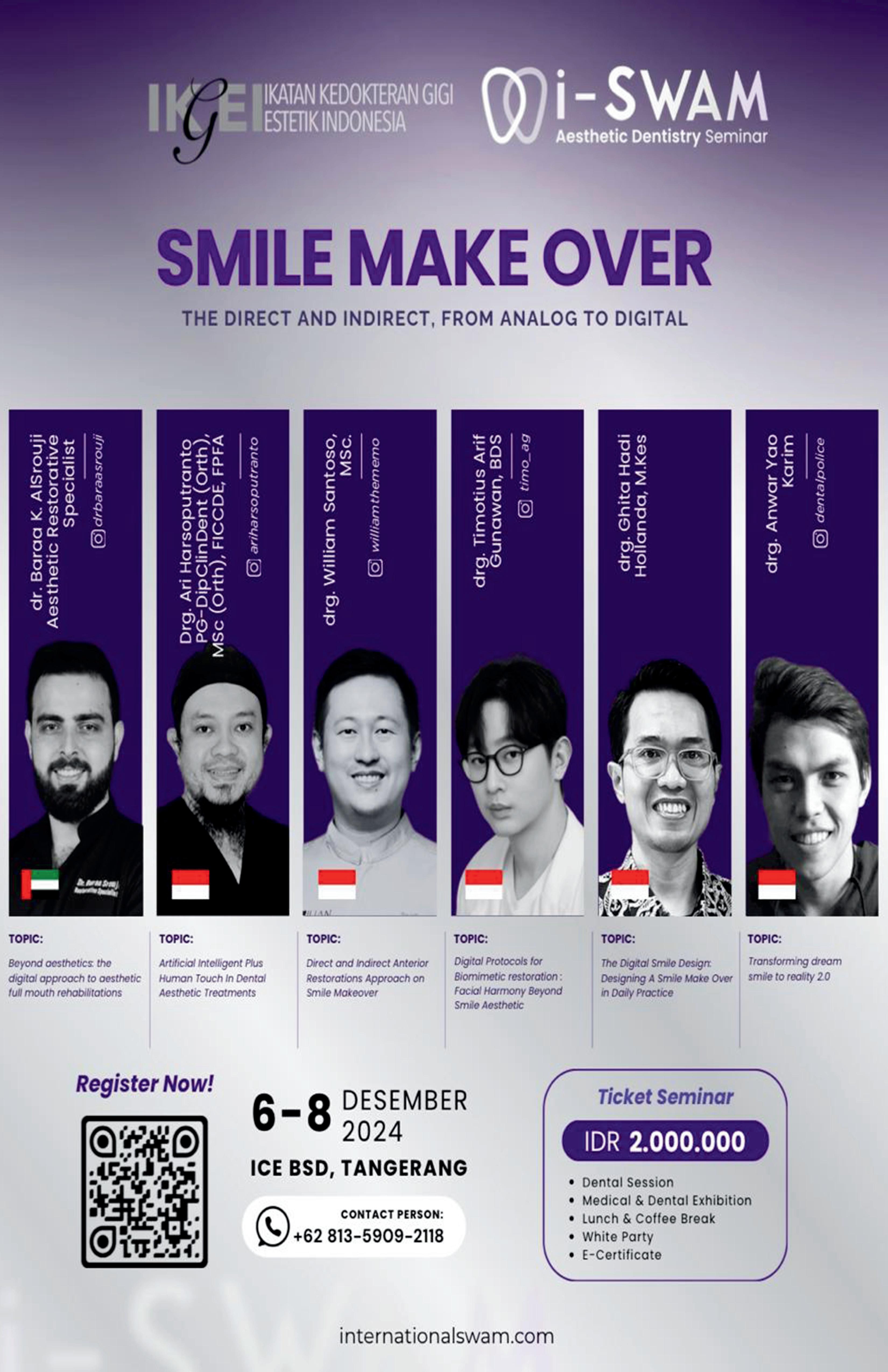 Rangkaianwebinarinimengusung tema besar Practical Esthetic, yang bertujuan memberikan pendekatandalamkonteks‘estetik’ yang bisa langsung diterapkan dalam praktik sehari-hari. drg. William menegas-kan, "Kami ingin semua dokter gigi, di mana pun mereka berada, memiliki kesempatan untuk belajar dan meningkatkan mutu pelayanan merekatanpaterbebaniolehbiaya yang tinggi." Dengan harga yang terjangkau, IKGEI memastikan bahwa setiap peserta dapat mengikuti dan meman-faatkan webinar ini untuk meningkatkan keterampilanmereka.