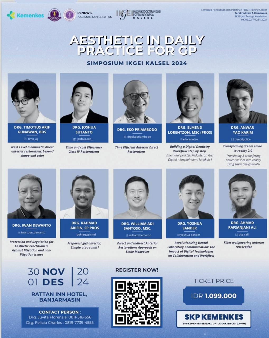 SimposiumdanAcaraPuncak Setelah rangkaian webinar selesai, IKGEI akan melanjutkan dengan acara simposium offline bertajuk ‘Aesthetic in Daily Practice for General Practitioner’. pada tanggal 30 November hingga 1 Desember 2024 di Banjarmasin, dan akan diisi dengan berbagai kegiatan seperti hands-on, pameran alat kedokteran gigi, serta pesta, lelang dan diskusi santaiantarsejawat.