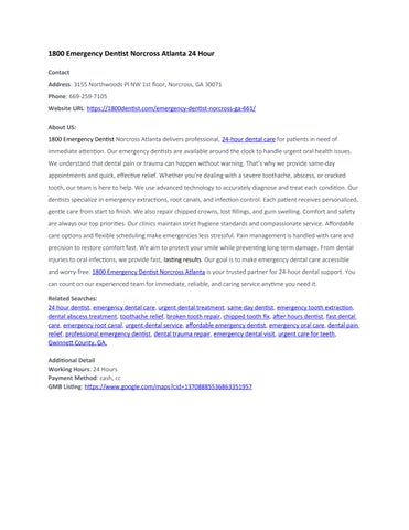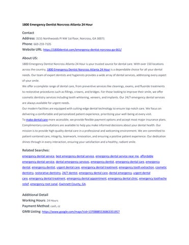 Phone: 669-259-7105 About US: 1800 Emergency Dentist Norcross Atlanta 24 Hour is your trusted source for dental care. With over 150 locations across the country, 1800 Emergency Dentist Norcross Atlanta 24 Hour is a dependable choice for all your dental needs. Our team of expert dentists and hygienists provides a wide array of dental services, addressing every aspect of your smile. We offer a complete range of dental care, from preventive services like cleanings, exams, and fluoride treatments to restorative procedures such as fillings, crowns, and bridges. For those looking to improve their smile, we offer cosmetic dentistry services including teeth whitening, veneers, and implants. Our 24/7 emergency dental services are always available for urgent needs. Our modern facilities are equipped with cutting-edge dental technology to ensure top-notch care. We focus on delivering a comfortable and personalized patient experience, prioritizing your well-being at every visit. To make dental care more accessible, we provide flexible payment options and accept most major insurance plans. Complimentary consultations are available to help you make informed decisions about your dental health. Our mission is to provide high-quality dental care in a professional and welcoming environment. We are committed to patient-centered care, integrity, teamwork, innovation, and ensuring a positive patient experience. Our dedication shines through in every interaction, ensuring your satisfaction and a healthy, radiant smile.