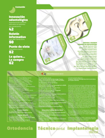 Publisher/Jaime Francisco Martínez Aceves jmartinez@dentistaypaciente.com.mx Director Asociado/Gilberto Salazar Nonato Directora Editorial/Mariangel Martínez López mmartinez@dentistaypaciente.com.mx Director de Arte y Diseño/Jesús Salas Pérez jesasez@dentistaypaciente.com.mx Coordinadora Editorial/Erika A. Dávalos Camarena eriale@dentistaypaciente.com.mx Ejecutivos Comerciales y de Negocios/ Héctor Ramos Romero, Carlos Martínez García, Alberto M. Velázquez Orta Fotografía Digital/Gerardo Barco Pérez Arte/Nancy Chavez Carreón Producción y Circulación/Julio César Gutiérrez Hernández Crédito y Cobranza/Juan Manuel Gutiérrez Fotografía e Ilustraciones/ Editorial Renascence Suscripciones/Patricia López Guerra Preprensa e Impresión/Editorial de Impresos y Revistas S.A. de C.V. Distribución/Comercializadora GBN S.A. de C.V. Calzada de Tlalpan #572, desp. C-302, col. Moderna Representante en Guadalajara/Sergio Mancera Valderrain smancera@dentistaypaciente.com.mx Contabilidad y Administración/Renato Muñoz
