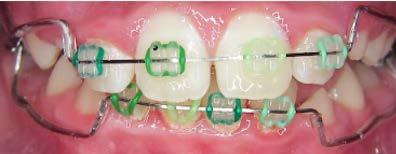 Se colocaron brackets cerámicos Roth 0.022, en OD. 12,11, 21, 22, 32, 31, 41 y 42, con tubos en OD. 16, 26, 36 y 46, se utilizó el arco utilitario de Elgiloy azul de 0.016 x 0.016, se activa para comenzar con la alineación y con la intrusión de los dientes anteriores superiores e inferiores (Figura 3).