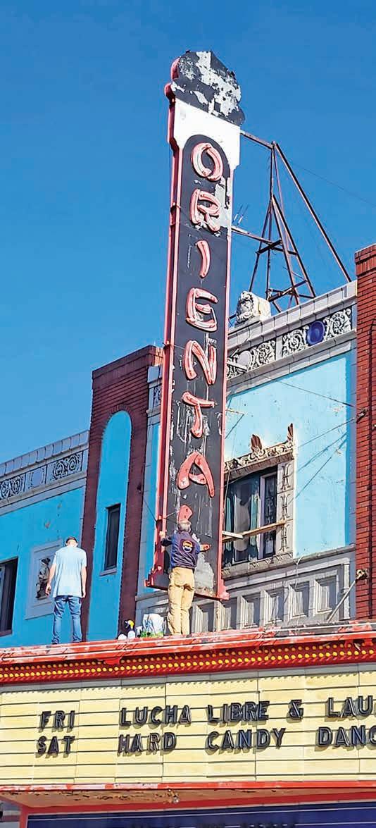An extensive restoration to the front of The Oriental Theater (called The O these days) reached a milestone last month. The tall vertical vintage sign above the theater’s marquee, the “blade,” was stripped down, restored, repainted and outfitted with new neon lettering.