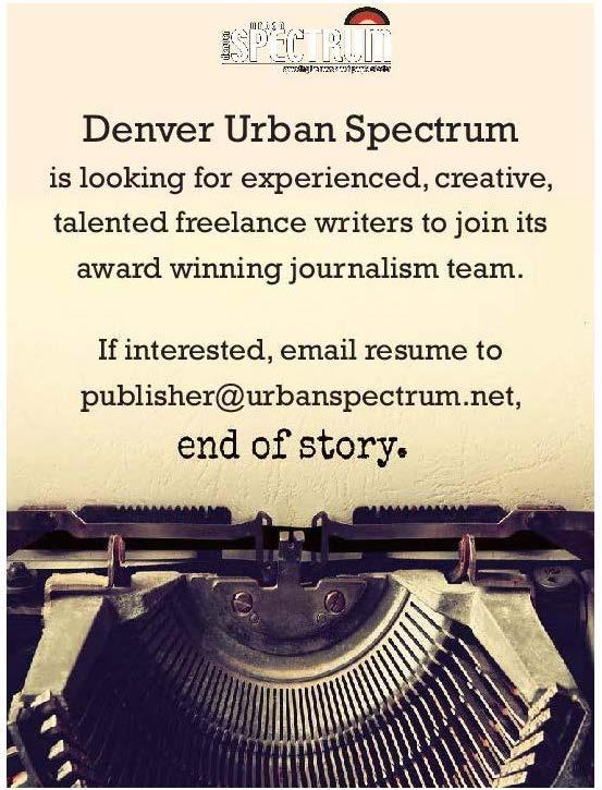 Write to Denver Urban Spectrum at P.O. Box 31001, Aurora, CO 80041. For advertising, subscriptions, or other information, call 303-292-6446, email publisher@urbanspectrum or visit the Website at www. denverurbanspectrum.com.