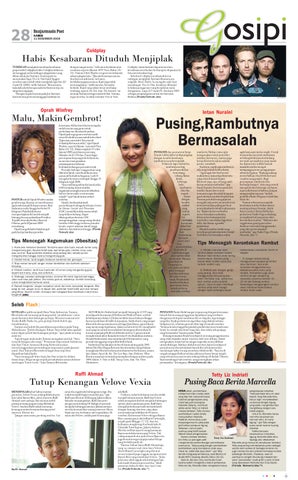 wanita itu. Bukan cuma rajin mengenakan cairan penyubur rambut (hair tonic), namun juga kerap dirawat ke salon melalui proses creambath. Anehnya, masih saja rambutnya ada yang rontok ketika disisir. “Agak-agak bete (bad mood, maksudnya) kalau tiap disisir ada yang rontok kayak begini. Khawatir juga, apa sih yang salah dari perawatan rambutku?” ujar Intan Nuraini, bertanya pada diri sendiri. Saran dari temantemannya agar dia tidak bergantiganti shampoo sudah dia jalankan. Namun pemilik lesung pipit ini mengaku tak putus asa untuk terus mencari racikan paling pas buat menyuburkan kembali mahkotanya itu. “Kukira belum terlambat menyelamatkan rambutku. Sebenarnya lumayan tebal rambutku, cuma kalau lagi stress dikit, dia ikutan ngambek,” gumamnya. Masalah rambut itulah yang membuat pemain sinetron Gembel Naik Kelas itu memakan waktu