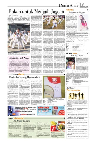 beladiri. Kedua, secara otomatis fisik anak sehat dan mentalnya kuat karena beladiri merupakan olahraga. Ketiga, jika anak berbakat maka ia dapat berprestasi melalui jalur sebagai atlet. Secara psikologis, berlatih beladiri juga mengajarkan anak untuk berpikir kritis, bagaimana mengatasi masalah dengan baik, membangun jiwa sosial, melatih kemandirian, kerjasama, toleransi dan sikap sportivitas. “Mengenai latihan, yang umum adalah seminggu dua kali, tapi kalau memang ada waktu boleh tiga kali seminggu. Sebenarnya paling bagus pagi hari, tapi anak-anak kan sekolah, jadi pagi hari bisa berlatih di hari libur, sedangkan hari sekolah latihannya sore atau malam,” terang Khairi. Teknik beladiri yang diajarkan adalah stand up fight dan ground fight. Dimaksud stand up fight adalah membeladiri dalam posisi berdiri, sedangkan ground fight adalah dalam posisi di bawah (duduk, berbaring) seperti halnya teknik bergulat. “Dalam posisi stand up dan ground, anak-anak juga diajarkan bagaimana menghadapi pola serangan statis dan dinamis. Statis umumnya jarak dekat, sedangkan dinamis sifatnya jarak renggang. Dari kedua pola itu diajarkan pula teknik tangan kosong, teknik menghadapi senjata dan bagaimana memanfaatkan berbagai benda sebagai senjata,” papar Khairi yang selain melatih di dojo, juga melatih privat untuk anakanak dan dewasa. (dea)
