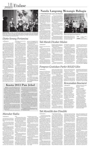 Kuota 2013 Pun Jebol SENIN (3/12) ini, BPH Migas berencana mengajukan tambahan kuota BBM subsidi sebanyak 1,2 juta kiloliter, senilai Rp 6 triliun. Tambahan kuota kali kedua dalam setahun ini diajukan karena Pertamina mengkhawatirkan kuota BBM bersubsidi tidak cukup sampai akhir 2012. Vice President Corporate Communication Pertamina Ali Mundakir beralasan, permintaan BBM bersubsidi hingga 20 November 2012 selalu melampaui jatah. Krisis BBM subsidi pun melanda Tanah Air. “Artinya telah terjadi over penyaluran terhadap kuota bulan berjalan masingmasing sekitar satu persen untuk premium dan emoat persen untuk solar, dan masih ada potensi terjadi over kuota sampai akhir 2012,” kata dia. Kendati Menko Perekonomian Hatta Rajasa dan Menkeu Agus Martowardojo mengeluhkan distribusi BBM subsidi tak tepat sasaran akibat mafia BBM, pemerintah dan DPR memberi sinyal menyetujui penambahan itu. Menyikapi kondisi itu, ekonom dari