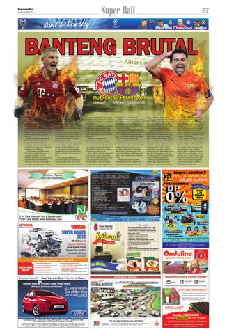 terakhir kompetisi domestik Liga Primera Spanyol akhir pekan lalu. “Benar, mereka (Bayern) sedang dalam bentuk yang terbaik. Tetapi di Liga Champions, detail-detail kecil akan menentukan pertandingan. Kami akan melakukan apapun untuk mendapatkan hasil baik di Munich,” kata gelandang berusia 33 tahun ini. Duel antara raksasa Jerman dan Spanyol pun bakal menghadirkan pertarungan kualitas dan nama besar per-individu dari kedua kubu. Nama-nama besar seperti Arjen Robben, Franck Ribery, Schweinstwiger, Lahm, Thomas Mueller, Andres Iniesta, Xavi, Gerard Pique dan tak lupa pemain terbaik dunia Lionel Messi bakal menghiasi glamornya big match tersebut. (Tribunnews.com/cen)