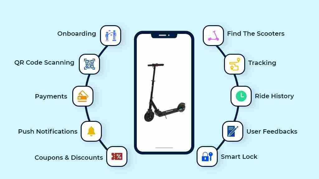 featurerangewith: Googlemapto ndnearbyscooteravailable Real-timeGPSTracking QRCodetoLockandUnlock PaymentGatewayIntegration SmartLock