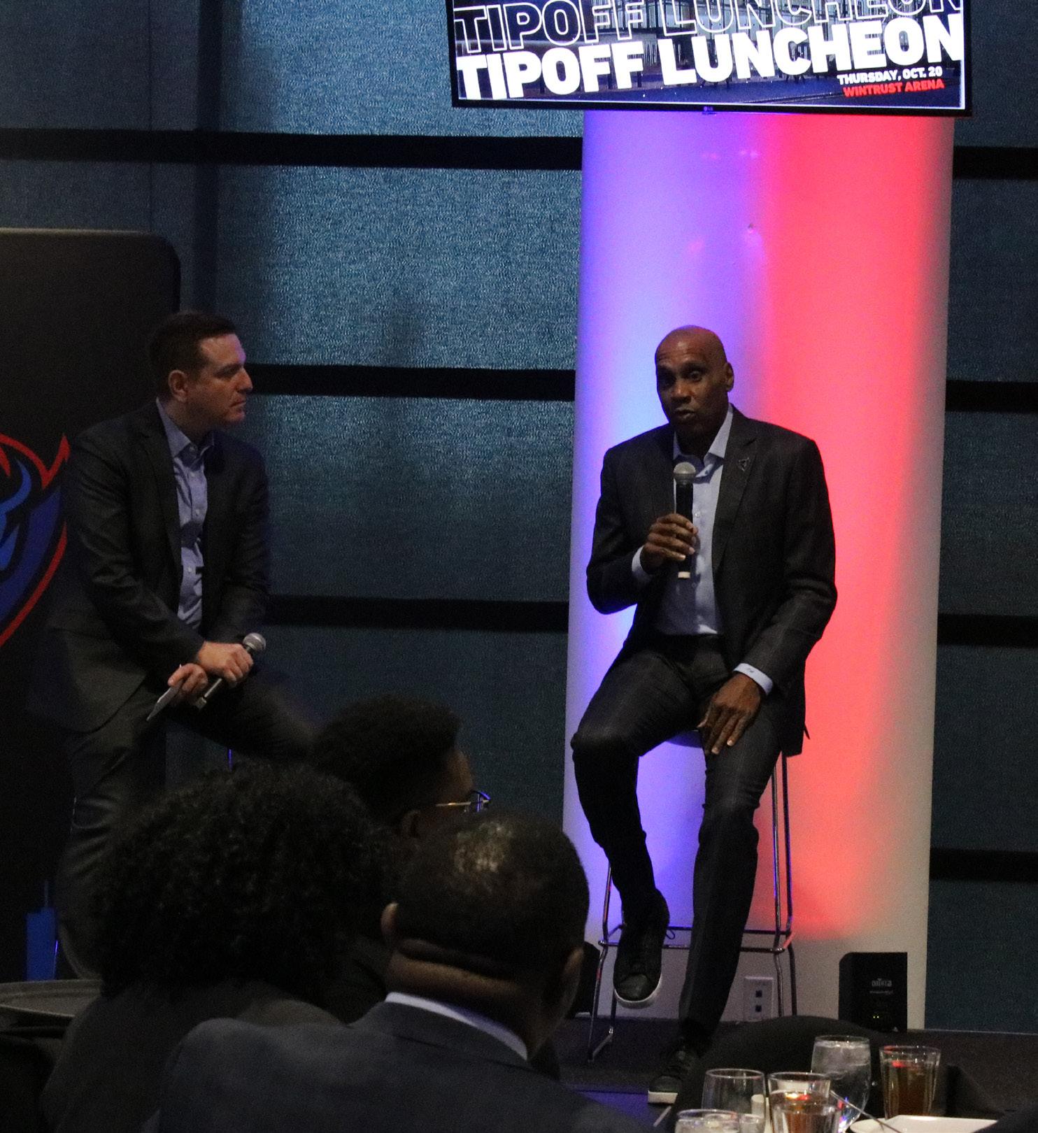 EVA EPLEY | THE DEPAULIA A new court was designed for DePaul’s games at Wintrust Arena for the upcoming season. The men will host Loyola (MD) on Nov. 4, and women will open against American university on Nov. 9. EVA EPLEY | DEPAULIA DePaul’s radio play by play broadcaster Zach Zaidman interviews Jade Edwards, Jalen Terry and Eral Penn during Thursday’s tipoff luncheon. EVA EPLEY | THE DEPAULIA