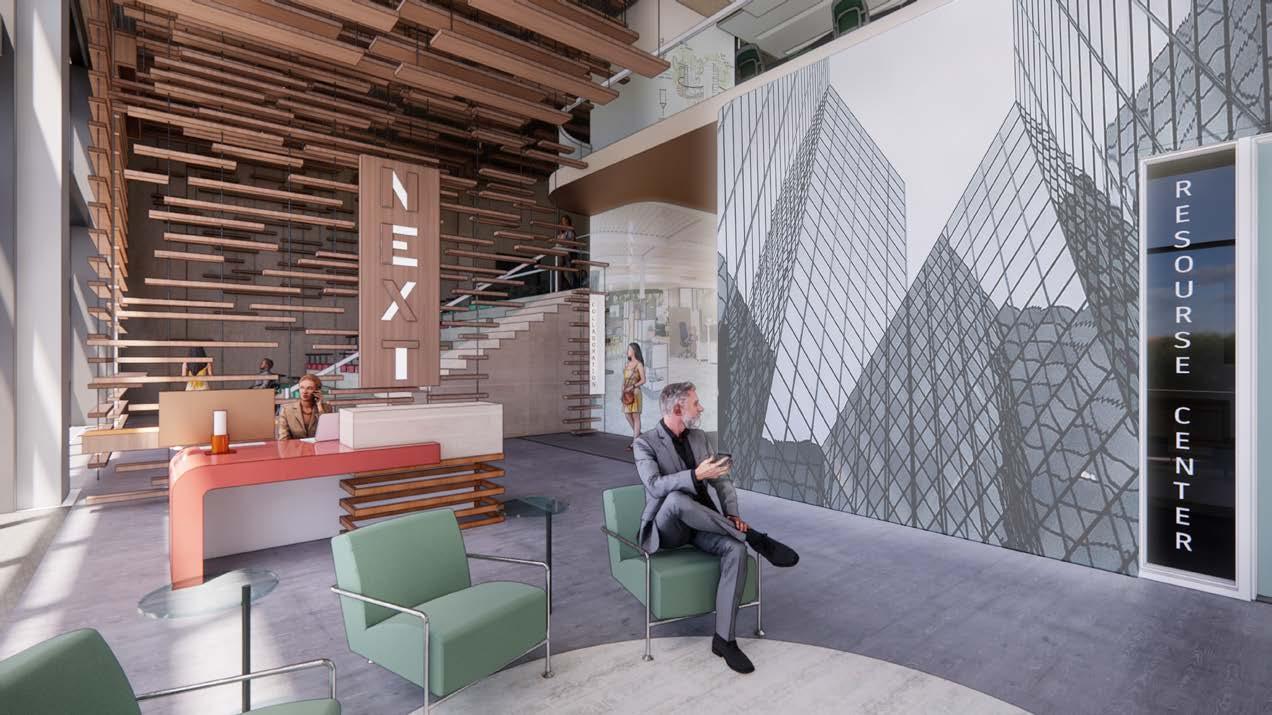 The floor plan strategically differentiates between public and private zones, as well as highand low-traffic areas. Reception, client spaces, and large gathering areas are positioned adjacent for seamless interaction. Meanwhile, the left side of the building is dedicated to employees, housing workstations, gathering areas, and essential resources to ensure privacy and focus.