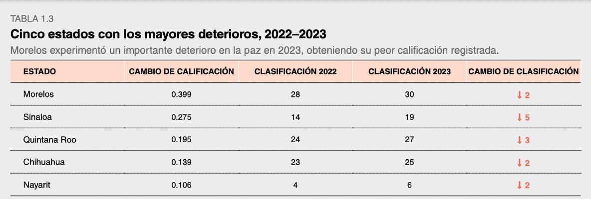 Los cinco estados que registraron los mayores deterioros en la paz entre 2022 y 2023 son Morelos, Quintana Roo, Chihuahua, Nayarit y Sinaloa.