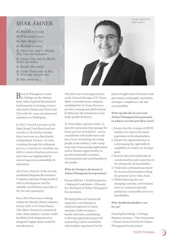 practical application of business and governance; and people, operations, strategies, compliance, risk and accountability. What specifically do you want Ātihau Whanganui Incorporation to achieve over the next three years? 1. E nsure that the strategy of AWHI enables it to achieve the future aspirations of the shareholders. 2. E nsure the organisation has or is developing the right skills & capabilities to achieve its strategic goals. 3. I ncrease the level and format of communication and connection to the whenua for all shareholders. 4. U ndertake continued assessment for increased participation along the primary sector value chain. 5. W hile balancing the ever changing economic environment, drive to continue to provide satisfactory sustainable returns to shareholders. Why should shareholders vote for me? Farming Knowledge + Strategic Business Acumen + New Generation = Future Focus Growth For Ātihau Whanganui Incorporation. TOITŪ TE MANA