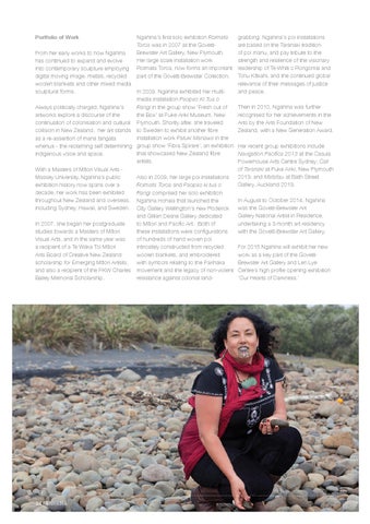 From her early works to now Ngahina has continued to expand and evolve into contemporary sculpture employing digital moving image, metals, recycled woolen blankets and other mixed media sculptural forms. In 2009, Ngahina exhibited her multimedia installation Paopao Ki Tua o Rangi in the group show 'Fresh out of Always politically charged, Ngahina's the Box' at Puke Ariki Museum, New artworks explore a discourse of the continuation of colonisation and cultural Plymouth. Shortly after, she traveled collision in New Zealand, her art stands to Sweden to exhibit another fibre installation work Patuki Manawa in the as a re-assertion of mana tangata whenua - the reclaiming self determining group show 'Fibra Spirare', an exhibition that showcased New Zealand fibre indigenous voice and space. artists. With a Masters of Māori Visual Arts Massey University, Ngahina’s public Also in 2009, her large poi installations exhibition history now spans over a Roimata Toroa and Paopao ki tua o decade, her work has been exhibited Rangi comprised her solo exhibition throughout New Zealand and overseas, Ngahina Hohaia that launched the including Sydney, Hawaii, and Sweden. City Gallery Wellington's new Roderick and Gillian Deane Gallery dedicated In 2007, she began her postgraduate to Māori and Pacific Art. Both of studies towards a Masters of Māori these installations were configurations Visual Arts, and in the same year was of hundreds of hand woven poi a recipient of a Te Waka Toi Māori intricately constructed from recycled Arts Board of Creative New Zealand woolen blankets, and embroidered scholarship for Emerging Māori Artists, with symbols relating to the Parihaka and also a recipient of the PKW Charles movement and the legacy of non-violent Bailey Memorial Scholarship. resistance against colonial land-
