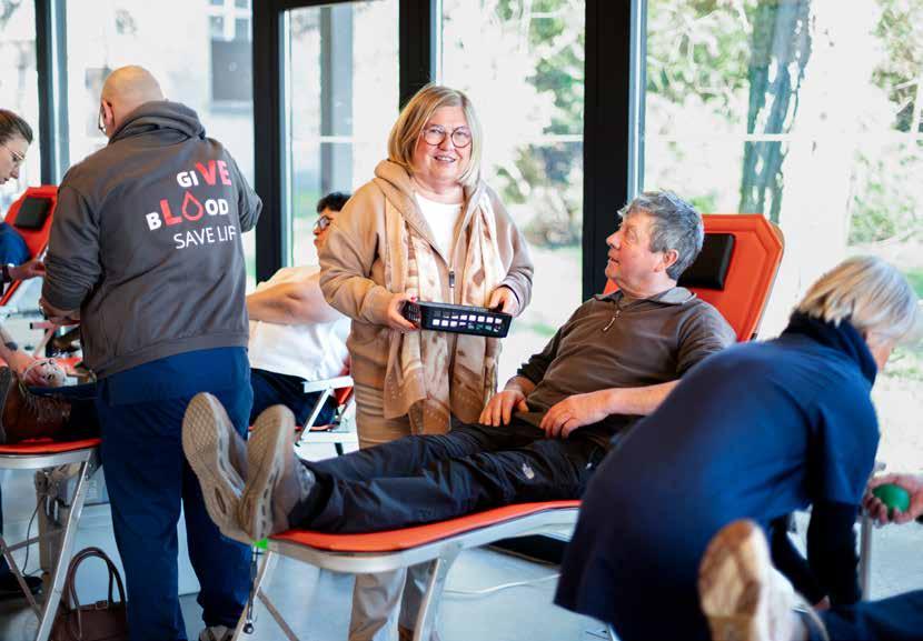zetten en de komst van de artsen, de verpleegkundigen en het materiaal af te wachten. Met ons trouwe ploegje smeren we de sandwiches en zetten we de drank klaar. Onze filosofie is om de donoren een warm welkom te geven. Je voelt dat de mensen dat waarderen. Bloedgevers blijven nodig. Simpelweg omdat bloed nodig blijft, vooral bij behandelingen van zieke mensen maar ook na ongevallen. En dus willen we de donoren in de watten leggen.’