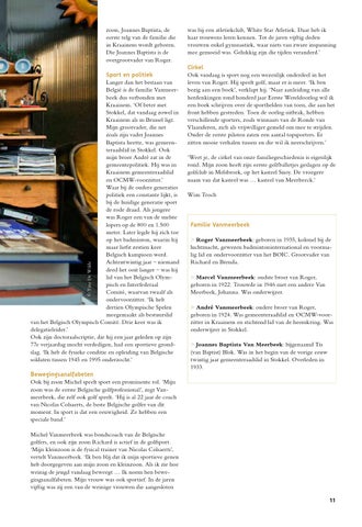 Sport en politiek Langer dan het bestaan van België is de familie Vanmeerbeek dus verbonden met Kraainem. ‘Of beter met Stokkel, dat vandaag zowel in Kraainem als in Brussel ligt. Mijn grootvader, die net zoals zijn vader Joannes Baptista heette, was gemeenteraadslid in Stokkel. Ook mijn broer André zat in de gemeentepolitiek. Hij was in Kraainem gemeenteraadslid en OCMW-voorzitter.’ Waar bij de oudere generaties politiek een constante lijkt, is bij de huidige generatie sport de rode draad. Als jongere was Roger een van de snelste lopers op de 800 en 1.500 meter. Later legde hij zich toe op het badminton, waarin hij maar liefst zestien keer Belgisch kampioen werd. Achtentwintig jaar – niemand deed het ooit langer – was hij lid van het Belgisch Olympisch en Interfederaal Comité, waarvan twaalf als ondervoorzitter. ‘Ik heb dertien Olympische Spelen meegemaakt als bestuurslid van het Belgisch Olympisch Comité. Drie keer was ik delegatieleider.’ Ook zijn doctoraalscriptie, die hij een jaar geleden op zijn 77e verjaardag mocht verdedigen, had een sportieve grondslag. ‘Ik heb de fysieke conditie en opleiding van Belgische soldaten tussen 1945 en 1995 onderzocht.’