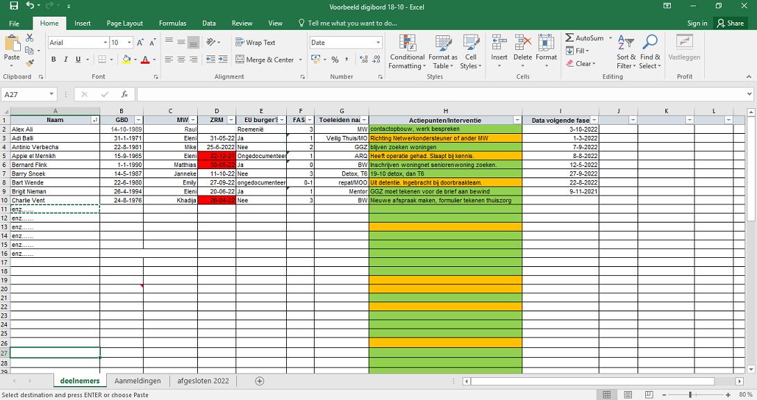 Digibord gebruiken we om het overzicht voor het team te behouden ondanks het gebruik van alle verschillende registratiesystemen. Met het Digibord, dat onderdeel uitmaakt van de CTI aanpak, kunnen we alle deelnemers gezamenlijk goed in beeld houden en het geeft een helder overzicht over de voortgang van de behandeling/ begeleiding van alle deelnemers.