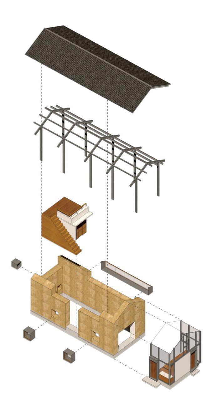 Cow dung collection as raw material for mud-brick construction. Roof constructed by Straw in bundle form. Self-built by villagers. Mud brick construction by community and children to experience natural material construction. Cow dung to provide tensile strength to the brick. Healing for Buffalo/ Cattle Fruit Storage for Buffalo Mud brick Composition 1