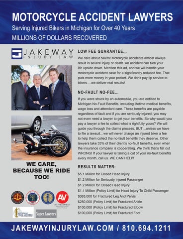 MotorCYCLe aCCIDent LawYers Serving Injured Bikers in Michigan for Over 40 Years MIllIOnS Of DOllarS recOvereD Low Fee Guarantee… We care about bikers! Motorcycle accidents almost always result in severe injury or death. An accident can turn your life upside down. Mention this ad, and we will handle your motorcycle accident case for a significantly reduced fee. That puts more money in your pocket. We don’t pay lip service to bikers….we deliver real results!