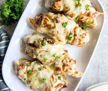 • Season the chicken breasts on both sides with garlic powder, salt, and pepper. Add the chicken breasts to a baking pan and top them with the caramelized onions. Place one slice of cheese over each chicken breast.