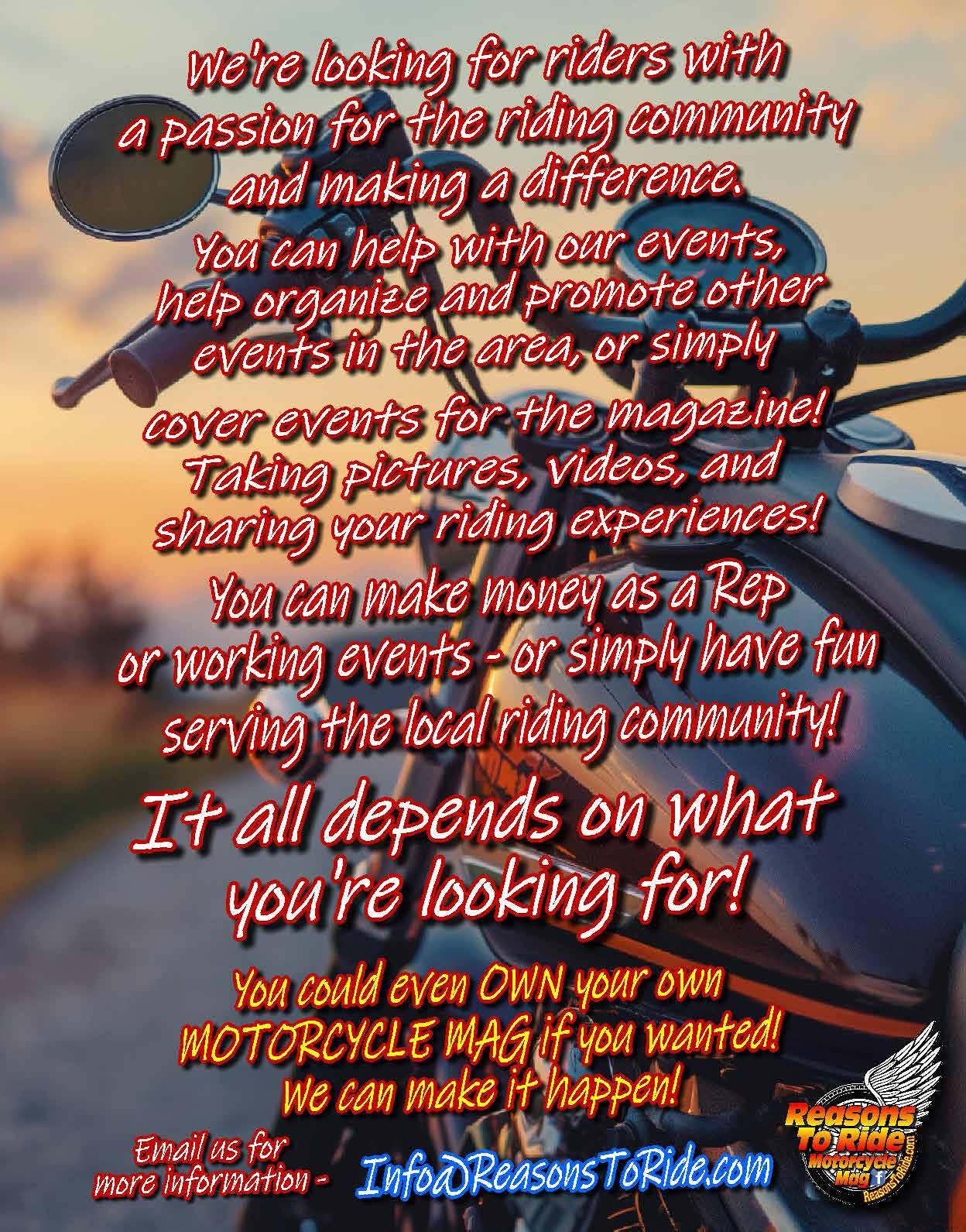 We’re looking for someone with a passion for the Veteran community that can help us establish a more consistent and effective resource for local Vets and their families. If you’re interested in this position, please shoot us an email at Info@ ReasonsToRide.com In addition to an overall Veterans Affairs Editor position, we have additional opportunities for folks in more regional positions. So location is not necessarily a major issue. The primary requirements are being organized, being able to talk to folks, and having a dedication to the Veterans Community.