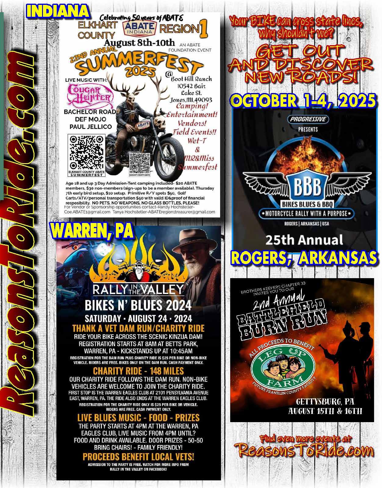 We are now reserving VENDOR and EXHIBITOR space for the Landing during the Geneva-on-the Lake Rally. It’s a great chance to connect with riders and sell crafts, talk about upcoming events, or simply get your message out. There are even a limited number of discounted spots available for non-profit organizations and artisan / craftsman. Email us at Info@ReasonsToRide.com for more information.