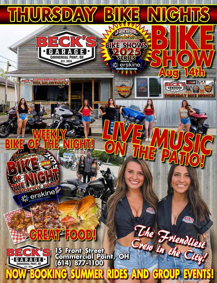 Located just south of Columbus, Beck’s Garage is one of the area’s most exciting Bike Nights with a great crowd, one of the friendliest crews anywhere, and of course COOL BIKES! This year, Beck’s Garage will be hosting a special BIKE NIGHT BIKE SHOW with Reasons To Ride. This will be a party for sure with QFM96 on site and other regional partners joining us for a fun evening. We will be hosting a SOUND CHALLENGE CLASS and have special awards for “home grown RAT BIKES”.