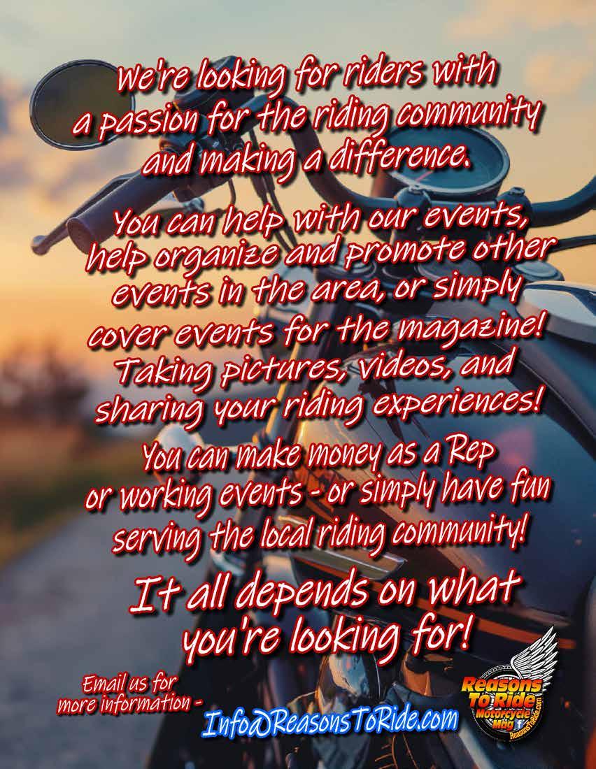 We’re looking for someone with a passion for the Veteran community that can help us establish a more consistent and effective resource for local Vets and their families. If you’re interested in this position, please shoot us an email at Info@ ReasonsToRide.com In addition to an overall Veterans Affairs Editor position, we have additional opportunities for folks in more regional positions. So location is not necessarily a major issue. The primary requirements are being organized, being able to talk to folks, and having a dedication to the Veterans Community.
