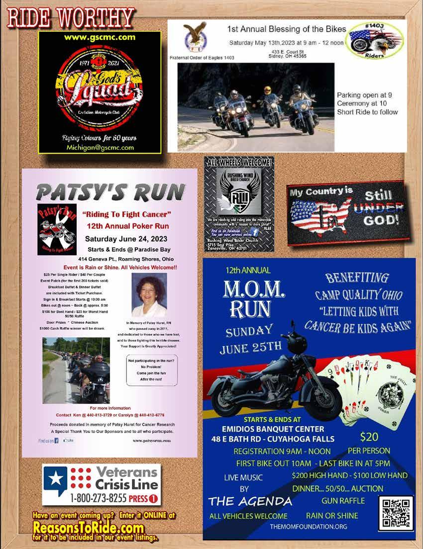 CONTENTS DEPARTMENTS 06 FROM THE EDITOR 08 ROAD TALES 14 MOTORCYCLE MINISTRY 15 BULLETIN BOARD 24 CALENDAR FEATURE 28 SPORT TOURING CORNER 30 IRON & INK 33 SERVICE SPECIALISTS 38 MOTORCYCLE EVENTS 39 MICHIGAN EVENT BULLETIN BOARD 41 OHIO EVENT BULLETIN BOARD 44 RECIPES 45 WORD SEARCH 46 RALLY SHOTS 48 SPONSOR DIRECTORY