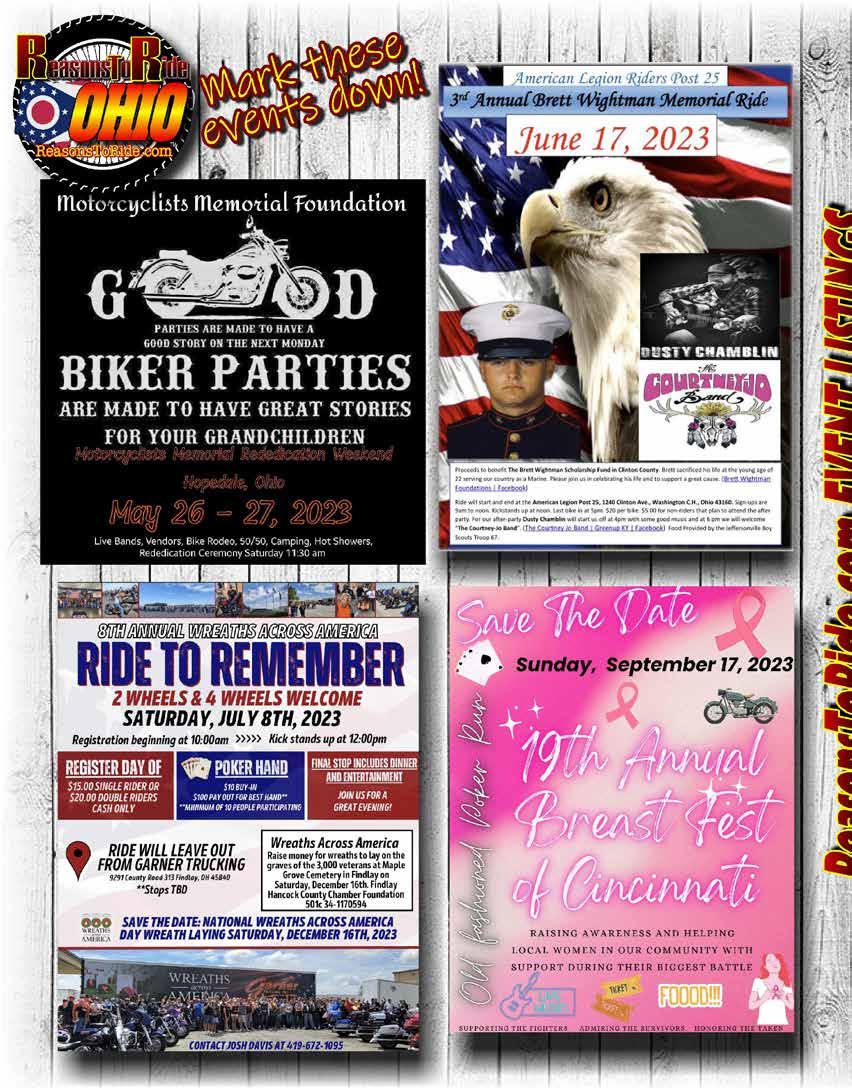 48 REASONS TO RIDE: GREAT LAKES EDITION POWERED BY REASONSTORIDE.COM 508 Fabrications MI 33 AM Leather Inc. MI 11 Amish Country Leather OH ........................................ 13 ARSENAL HARLEY-DAVIDSONMI ............... 18, 30,49 Avon Boot Shop OH .................................................. 32 Backroads of Appalachia MI 34 Backwoods Tattoo MI 31 Bair's Powersports OH 32 Big Steve's Designz MI 33 Bikes on the Bricks MI ................................................. 18 Buckwild SaloonMI .................................................... 11 Cash 4 Motorcycles OH MI 33 Chicky's Paradise Saloon MI 11 Christian Motorcycles Association OH 14 Conspiracy Tattoo OH 31 Crazy Cycles OH 41 Crazy Fox Saloon (Bucyrus) OH ............................... 13 Deftone Cycles (Chagrin Falls) OH .......................... 33 Dick Scott Powersports MI 32 Dog House Saloon MI 35 Farmer's Tavern MI 11 Fink's Harley-Davidson OH 13 First Equity Residential Mortgage MI ........................ 15 Freddy's Bar & Grill MI .............................................. 45 Geneva-on-the-Lake Thunder Zone / Bike Show OH .... 18 God Squad MI 15 Hardcore Custom Cycles OH 33 Inkoholics OH 31 Iron Horse Campgrounds SD 33 Iron Pony / Pony Powersports OH 4,5 I-X Center Piston Power Show OH ............................... 2 Johnny's Grill & Pizzeria OH ..................................... 45 JR Bud Marketing LLC MI ........................................... 33 Knucklehead Saloon OH 13 Mama Rene's OH 13 Melvin "Hog Town" Tavern MI 11 Michigan Bike Life MI 9, back cover Mill Dam Corner Grille OH ................................. 13, 38 MKS Supply OH ........................................................ 26 Motorcycle Audio & 12V Accessories 35 MSTA 28, 29 NEO Pro Imaging 33 Nostalgia Motorcycle Drag Racing MI 39 Ohio Bike Week Bike Show OH ................................ 17 Ohio Dept. of Public Safety (Motorcycle Ohio) ...... 36 Old Firehouse Winery OH ........................................ 45 Original Margaritaville OH 13 Paddy Whacks MI 11 Patriot's Garage MI 15, 39 Progressive OH INSIDE COVER, 1 Rally at Rt. 46 MI......................................................... 41 Ray C's Extreme ......................................................... 35 Ray C's Harley-Davidson MI 17 Ray C's Rodeo & Bike show MI 42 Rebel Road MI 3 Redneckside Motorcycle Whips OH 13 Remies Bar MI .............................................................. 11 Rushing Wind Biker Church OH ................................ 15 Scooters Bar & Grill MI 23 Shielded Souls MI 39 Silver Dollar Pub & Grill MI 11 Southeast Harley-Davidson OH 19, Stars, Stripes & Bikes Bike Show MI ................... 18, 43 Steel Saddles Thunder Rally 2023 MI ..................... 42 Steve's Backroad Bar and Grill OH........................... 13 Straight Shooter Custom Cycles, LLC OH 33 Tecumseh Harley-Davidson MI 15, 26 The Mason Jar OH 13 The Real McCoy Tattoo Studio OH 31 The Rock OH ................................................................ 17 Victory Biker Church OH ............................................ 15 Vinton County Wild Turkey Festival OH 17,19 Walneck's OH 41 Walnut Bar MI 11 Whitehorse Biker Church OH 14 Wild Mike's MI ............................................................ 11 Wrench N Ride MI ..................................................... 33 Youngstown Harley-Davidson OH ............................. 41 Zeppe's (Newbury) OH 12, 42