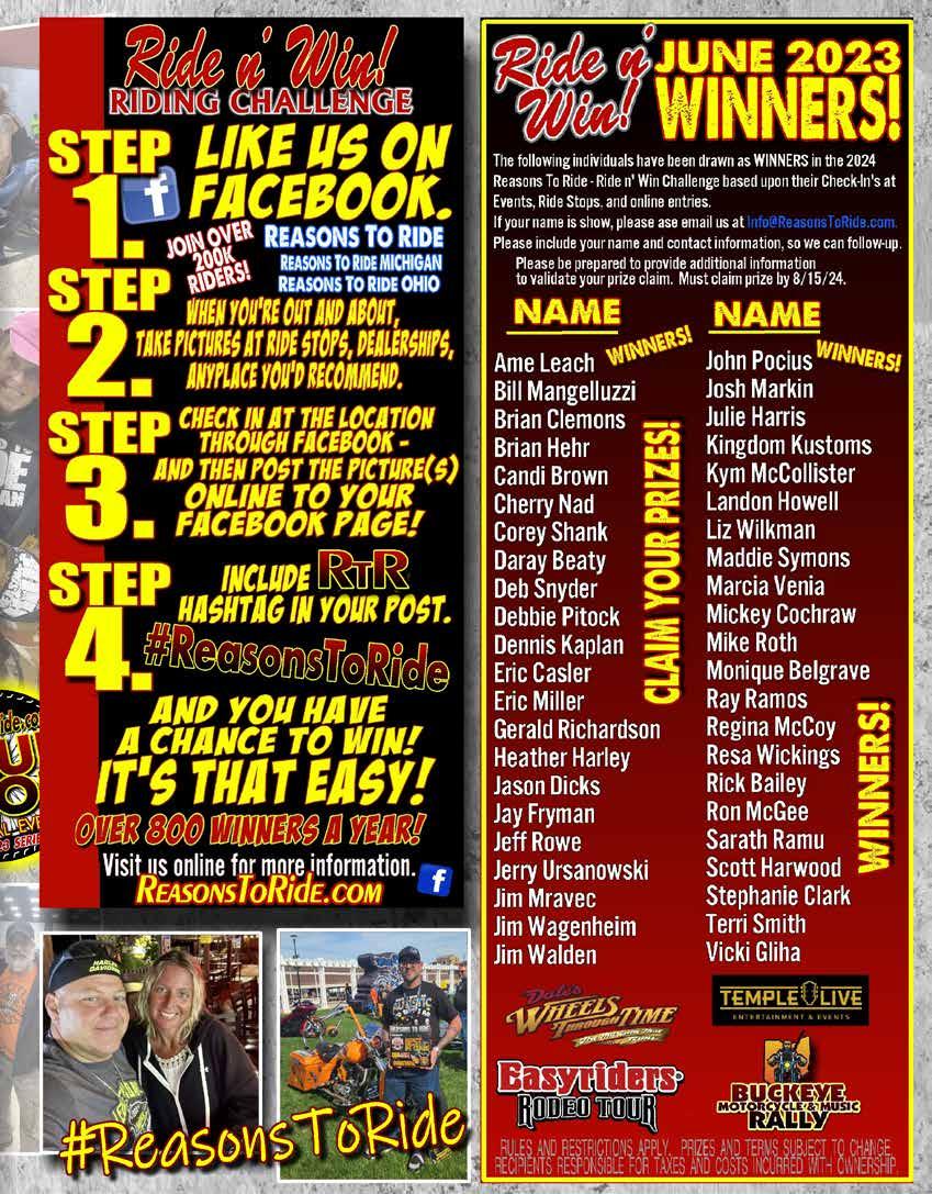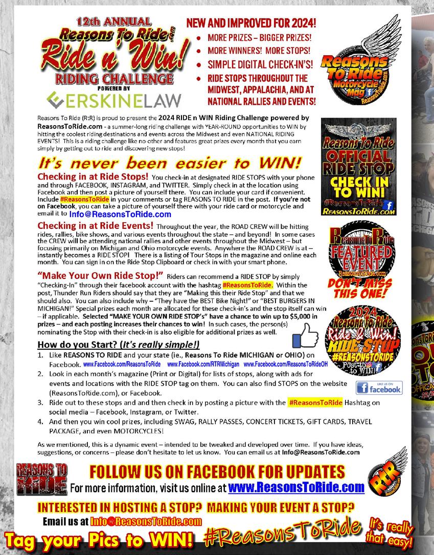 This month we begin announcing winners for our 2024 Ride n’ Win Riding Challenge! Each month we will draw winners from those entering in the challenge! This isn’t a skills challenge – it’s a challenge to just get out and ride as much as possible and share where you’ve been. We encourage riders to explore new areas and check out new events. We challenge riders to join us at new rallies and rides all across the Midwest – and even at some of the biggest national events across the country. And along the way, we’re looking for new places to stop!
