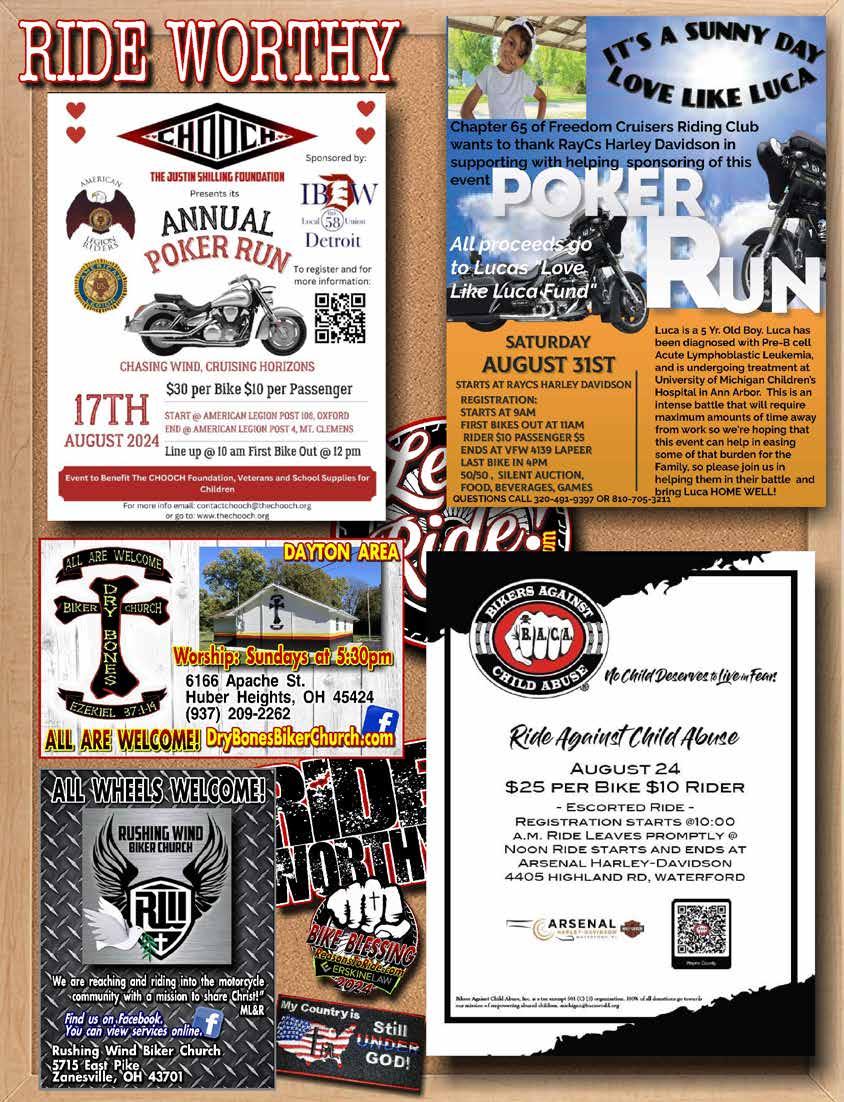 If you have a message that you’d like to share with riders across Ohio and the Midwest, let us know. Reasons To Ride welcomes the opportunity to work with established motorcycle ministries. Feel free to share upcoming events with us as well, by emailing information to Events@ReasonsToRide.com