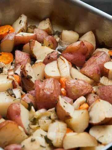 • Bake at 375 for 45 minutes to an hour, or until they’re tender.Stir them up in the roaster pan to mix all the herbs, oil and remaining broth.