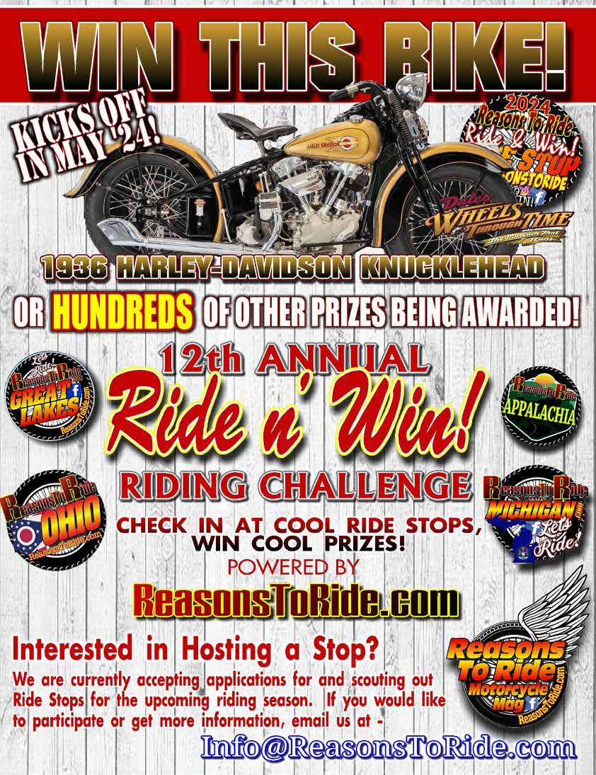 Since its launch in 2011, this program has evolved and grown every year as we try to improve things and ensure that it’s a great time for everyone. This year is no exception, as we add even MORE STOPS and WAY MORE PRIZES! Our primary area of focus for our Midwest stops is across Michigan and Ohio. However, we will are also adding stops throughout West Virginia, Kentucky, and Western Pennsylvania as we develop our new Reasons To Ride: Appalachia magazine and in upstate New York and even Southern Ontario as we expand in that direction with HARD TALES MAGAZINE. Our network of magazines cover some of the best riding in the country and there are literally thousands of really cool stops to discover.