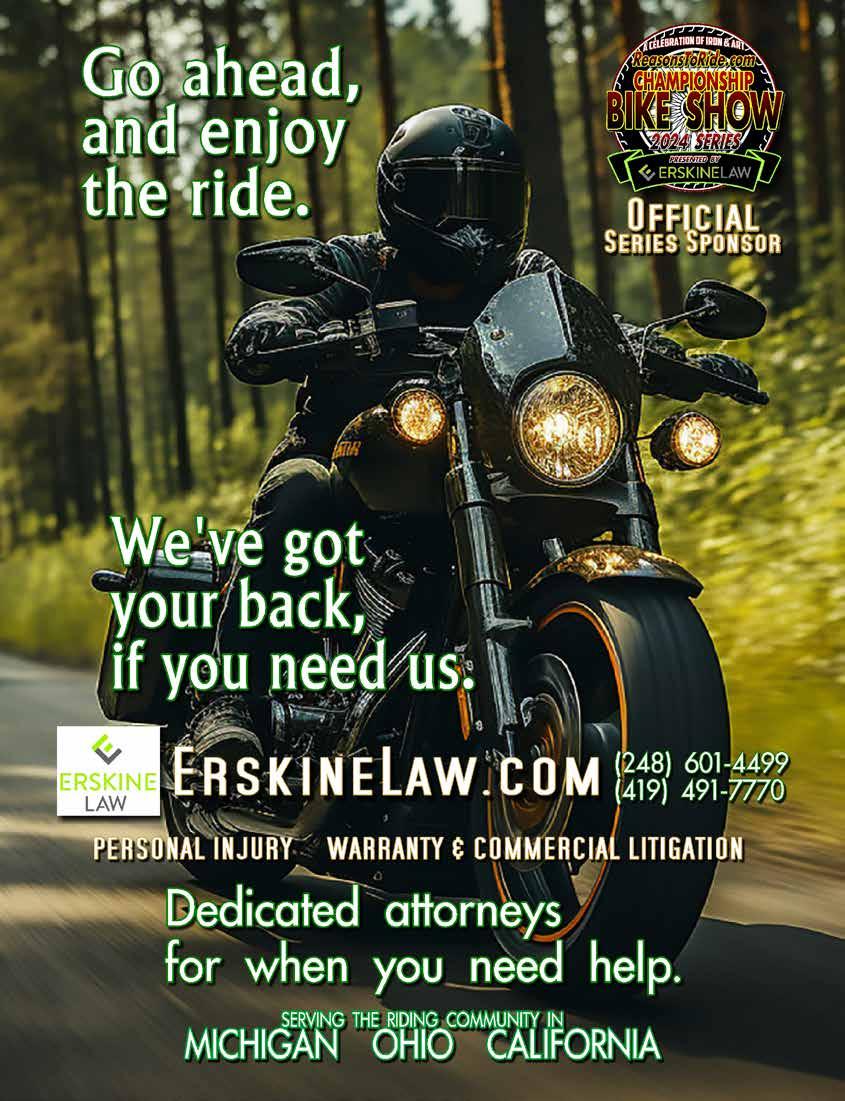 As always, the RtR crew will be out and about hitting various Bike Nights, Rides, and other events throughout the upcoming riding season. At select events, our team and our partners will be recognizing one or two bikes as “BIKE OF THE NIGHT” as part of the 2024 Championship Bike Show Series –presented by Erskine Law.