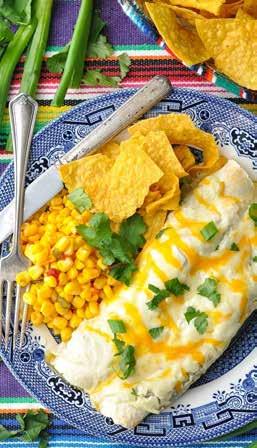 • Place a heaping ½ cup of the chicken mixture in the center of each tortilla. Roll up and place seam-side down in the baking dish.