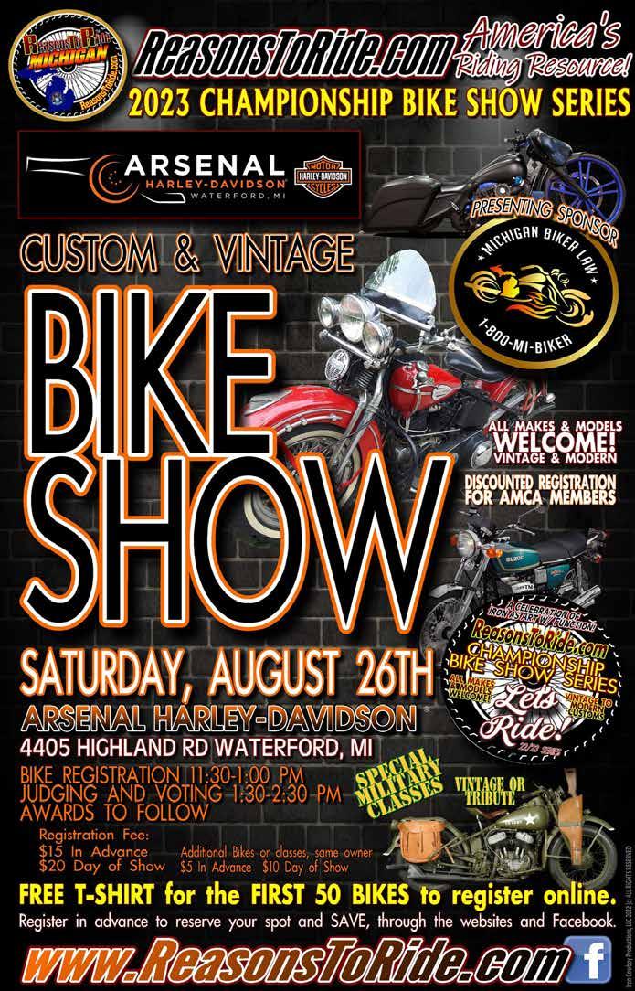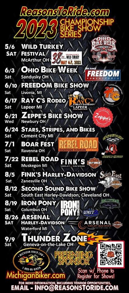 Reasons To Ride: Michigan is proud to bring the 2023 CHAMPIONSHIP BIKE SHOW SERIES to MICHIGAN'S BIGGEST BIKER BASH - REBEL ROAD 2023! This awesome rally in Downtown Muskegon, Michigan is sponsored in part by our friends at MICHIGAN BIKER LAW and MILLER LITE and benefits the Child Abuse Council of Muskegon County.