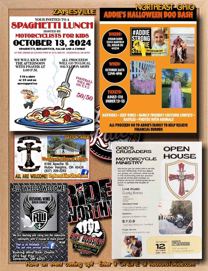If you have a message that you’d like to share with riders across Ohio and the Midwest, let us know. Reasons To Ride welcomes the opportunity to work with established motorcycle ministries. Feel free to share upcoming events with us as well, by emailing information to Events@ReasonsToRide.com