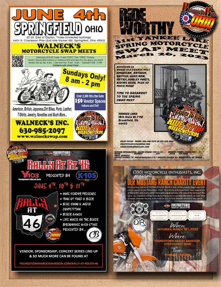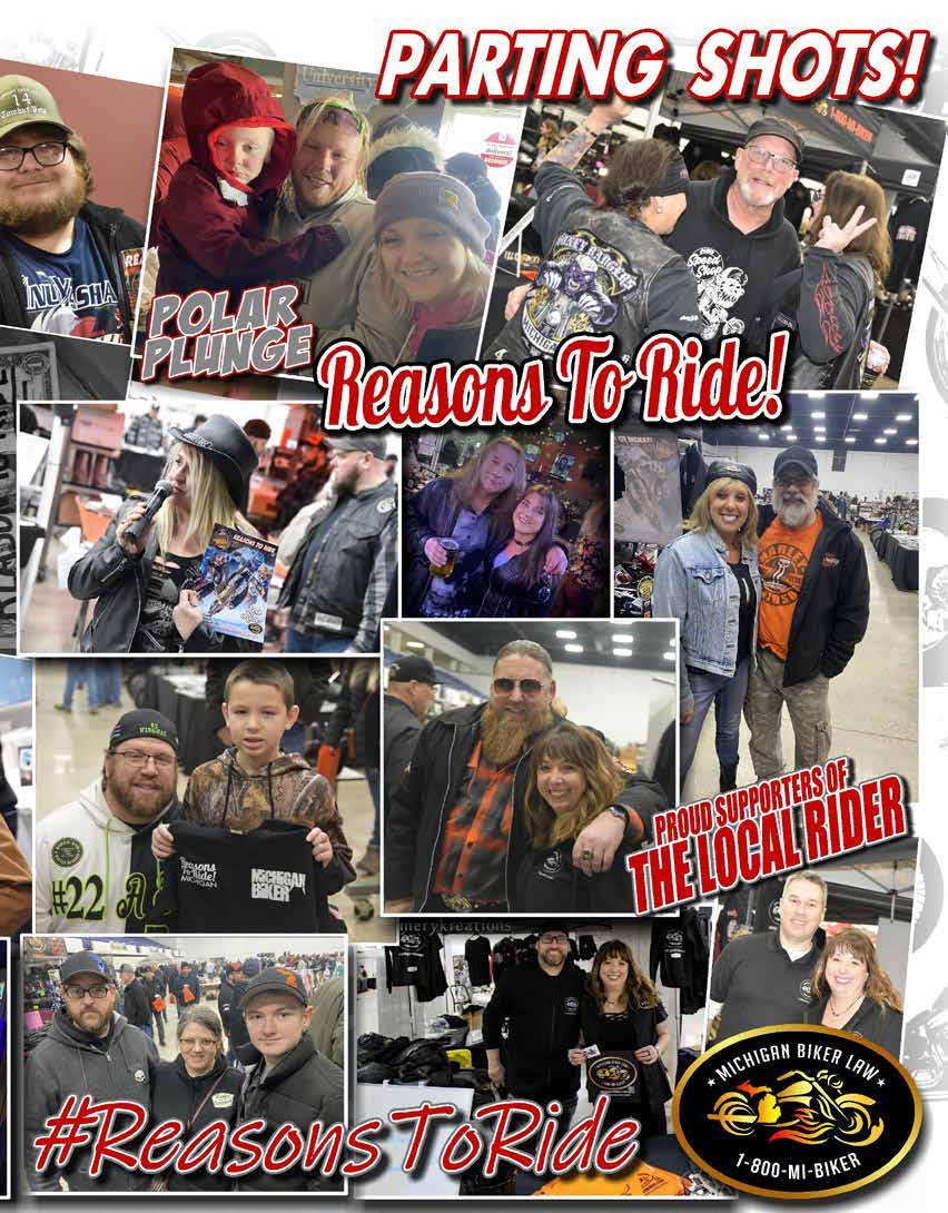 48 REASONS TO RIDE: GREAT LAKES EDITION POWERED BY REASONSTORIDE.COM 508 Fabrications MI 33 AM Leather Inc. MI 11 Amish Country Leather OH ........................................ 13 ARSENAL HARLEY-DAVIDSONMI ............... 18, 30,49 Avon Boot Shop OH .................................................. 32 Backroads of Appalachia MI 34 Backwoods Tattoo MI 31 Bair's Powersports OH 32 Big Steve's Designz MI 33 Bikes on the Bricks MI ................................................. 18 Buckwild SaloonMI .................................................... 11 Cash 4 Motorcycles OH MI 33 Chicky's Paradise Saloon MI 11 Christian Motorcycles Association OH 14 Conspiracy Tattoo OH 31 Crazy Cycles OH 41 Crazy Fox Saloon (Bucyrus) OH ............................... 13 Deftone Cycles (Chagrin Falls) OH .......................... 33 Dick Scott Powersports MI 32 Dog House Saloon MI 35 Farmer's Tavern MI 11 Fink's Harley-Davidson OH 13 First Equity Residential Mortgage MI ........................ 15 Freddy's Bar & Grill MI .............................................. 45 Geneva-on-the-Lake Thunder Zone / Bike Show OH .... 18 God Squad MI 15 Hardcore Custom Cycles OH 33 Inkoholics OH 31 Iron Horse Campgrounds SD 33 Iron Pony / Pony Powersports OH 4,5 I-X Center Piston Power Show OH ............................... 2 Johnny's Grill & Pizzeria OH ..................................... 45 JR Bud Marketing LLC MI ........................................... 33 Knucklehead Saloon OH 13 Mama Rene's OH 13 Melvin "Hog Town" Tavern MI 11 Michigan Bike Life MI 9, back cover Mill Dam Corner Grille OH ................................. 13, 38 MKS Supply OH ........................................................ 26 Motorcycle Audio & 12V Accessories 35 MSTA 28, 29 NEO Pro Imaging 33 Nostalgia Motorcycle Drag Racing MI 39 Ohio Bike Week Bike Show OH ................................ 17 Ohio Dept. of Public Safety (Motorcycle Ohio) ...... 36 Old Firehouse Winery OH ........................................ 45 Original Margaritaville OH 13 Paddy Whacks MI 11 Patriot's Garage MI 15, 39 Progressive OH INSIDE COVER, 1 Rally at Rt. 46 MI......................................................... 41 Ray C's Extreme ......................................................... 35 Ray C's Harley-Davidson MI 17 Ray C's Rodeo & Bike show MI 42 Rebel Road MI 3 Redneckside Motorcycle Whips OH 13 Remies Bar MI .............................................................. 11 Rushing Wind Biker Church OH ................................ 15 Scooters Bar & Grill MI 23 Shielded Souls MI 39 Silver Dollar Pub & Grill MI 11 Southeast Harley-Davidson OH 19, Stars, Stripes & Bikes Bike Show MI ................... 18, 43 Steel Saddles Thunder Rally 2023 MI ..................... 42 Steve's Backroad Bar and Grill OH........................... 13 Straight Shooter Custom Cycles, LLC OH 33 Tecumseh Harley-Davidson MI 15, 26 The Mason Jar OH 13 The Real McCoy Tattoo Studio OH 31 The Rock OH ................................................................ 17 Victory Biker Church OH ............................................ 15 Vinton County Wild Turkey Festival OH 17,19 Walneck's OH 41 Walnut Bar MI 11 Whitehorse Biker Church OH 14 Wild Mike's MI ............................................................ 11 Wrench N Ride MI ..................................................... 33 Youngstown Harley-Davidson OH ............................. 41 Zeppe's (Newbury) OH 12, 42