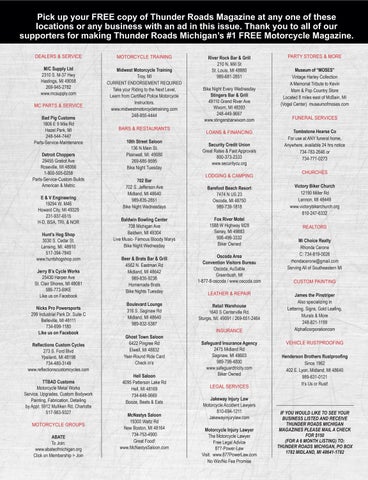 IF YOU WOULD LIKE TO SEE YOUR BUSINESS LISTED AND RECEIVE THUNDER ROADS MICHIGAN MAGAZINES PLEASE MAIL A CHECK FOR $150 (FOR A 6 MONTH LISTING) TO: THUNDER ROADS MICHIGAN, PO BOX 1782 MIDLAND, MI 48641-1782