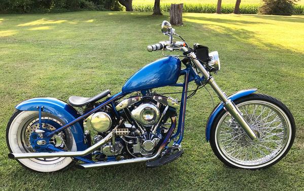 • Sante Frame 4130 Chrome Moly w/ Wide Glide forks & Sportster Tank (2 Gallon) • Paint GM HHR Voodoo Blue • 21” 80 Spike Front Wheel w/ custom front fender • Fat Boy Rear Wheel w/ modified Yamaha Badger rear fender • White Wall Tires • Motor Shovelhead 77 • Oil Pump S+S w/ custom oil tank 2 3/4 quarts & braided stainless lines • Carburetor - S + S • Exhaust 1 3/4” Straight Out • Transmission Rebuilt 78-80 • Belt Drive (Promo) • West Eagle Seat • Custom 5” Headlight RE ADERS RIDES