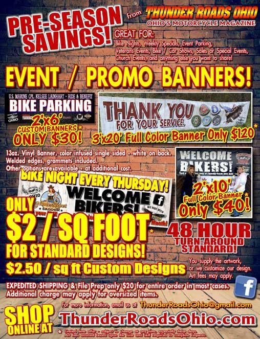 AMSOIL WWW.THUNDERROADSOHIO.COM BALCER PERFORMANCE & RESTORATION 565 BROADWAY AVE BEDFORD, OH 44146 (440) 945-6829 BEAR’S VINTAGE METALWORKS 408 WEST MAIN ST RAVENNA, OH 44266 (330) 297-7755 CASH 4 MOTORCYCLES CASH4MOTORCYCLES.COM RENEGADE GENTLEMEN CUSTOMS 7935 CHARDON RD. KIRTLAND, OH (216) 970-4437