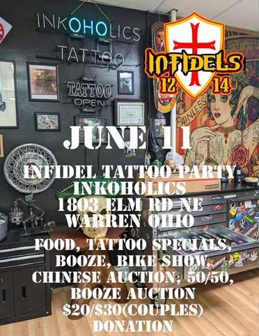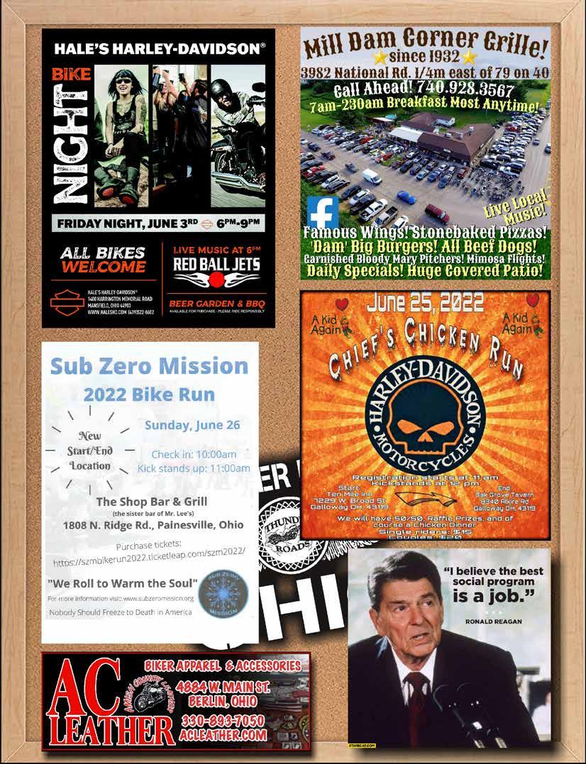 WE WOULD LIKE TO THANK ALL OF OUR SPONSORS THAT HELP MAKE THIS MAGAZINE POSSIBLE. IT IS ONLY WITH THEIR SUPPORT AND COMMITMENT THAT WE CAN PRODUCE WHAT WE BELIEVE TO BE THE FINEST REGIONAL MOTORCYCLE PUBLICATION IN THE NATION. AC Leather................................................................... 53 Amber's Ride ............................................................... 54 Amherst Meadowlarks MC / MX............................. 38 Amish Country Leather............................................... 53 Auto Boutique ..............................................inside cover Avon Boot Shop.......................................................... 42 Bair's Powersports....................................................... 50 Bears Vintage Metalworks/ Vintage Motorcyle Museum......7 Biker to Biker Consignment........................................ 53 Bikers for Christ ............................................................13 CAM Cycle ................................................................. 39 Cash 4 Motorcycles ................................................... 39 Cleveland Bikers for Charity.......................................18 COMBAT VETS MA ................................................... 55 Conspiracy Tattoo....................................................... 35 Crawford Auto Aviation Museum .........................9, 23 Crazy Boars Custom Cycles...................................... 39 Crazy Fox Saloon (Bucyrus)...................................... 45 Crystal Rock Campground ........................................ 38 Deftone Motorcycles.................................................. 39 Dusty Armadillo ............................................ 22, 49, 55 Easy Riders Events ......................................................19, Fink's Harley-Davidson................................. 35, 46, 54 Fountain City Cycle .................................................... 39 Geico...................................................inside back cover Geno's (Medina) ........................................................ 45 Greater Toledo Veterans Ride ....................................17 Hales Harley-Davidson .............................................. 50 Harley-Davidson of Eastgate..................................... 43 Hi Point Firearms (MKS supply)................................. 42 Holeshot KTM............................................................. 39 Hunter Street Saloon (Logan).................................... 56 Inkoholics Tattoo ........................................... 34, 35, 48 Iron Horse Campgrounds .......................................... 37 Iron Pony / Pony Powersports .......................... 55, 4, 5 Jeff Stanton Adventures.............................................. 33 Jimmy Bukketts............................................................. 53 Johnny's Pizza (Newbury)..........................................11 Last Call Biker Church .................................................13 Lexington Blueberry Festival Car & Bike Show........ 55 Lucas County Fair Bike Show ............................. 22, 54 Machine Gun Preacher.................................14, 15, 40 Mama Renies Pizza.................................................... 57 Meadowlarks.............................................................. 38 Mee's Promotions/Lima Half Mile ....... 29, back cover Mill Dam Corner Grille ....................................... 53, 56 Ohio Dept. of Public Safety (Motorcycle Ohio).......41 Old Firehouse Winery................................................ 57 Original Margaritaville.............................................. 50 Phatt Back Customz.................................................... 42 Progressive Insurance....................................................3 Queen City Harley-Davidson .................................... 52 Renegade Gentleman ................................................ 39 Riders Share................................................................ 40 Rookie's Sports Bar and Grill .................................... 49 Rushing Wind Biker Church........................................13 Sassy's (Twinsburg)......................................................51 Shakers Public House..................................................51 South East Harley-Davidson ..................... 1,47, 22, 55 Straight Shooter Custom Cycles................................ 39 The Barn-Zanesville .................................................... 37 The Bike Shop ............................................................. 39 The Hydrant (Berea)................................................... 45 The Mason Jar ............................................................ 57 The Max (Logan)........................................................ 37 The Real McCoy Tattoo Studio........................... 34, 35 Union County Fair Bike show .................................... 54 Walneck's.................................................................... 48 Warren Harley Davidson........................................... 42 Whitehorse Biker Church ............................................12 Youngstown Cycle ...................................................... 39 Zeppe's (Newbury)................................................2, 22