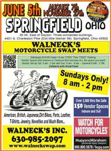 Buy, Sell, Trade - All kinds of New & Used Motorcycle Parts and Accessories Admission: $10.00, under 14 Free - Free Parking Vendor Price: $50.00 - Vendor setup 6am-8am Clark County Fairgounds 4401 S. Charleston Pike,Springfield,OHIO,45502 (630) 985-2097 - Buzz or Pixie Walneck