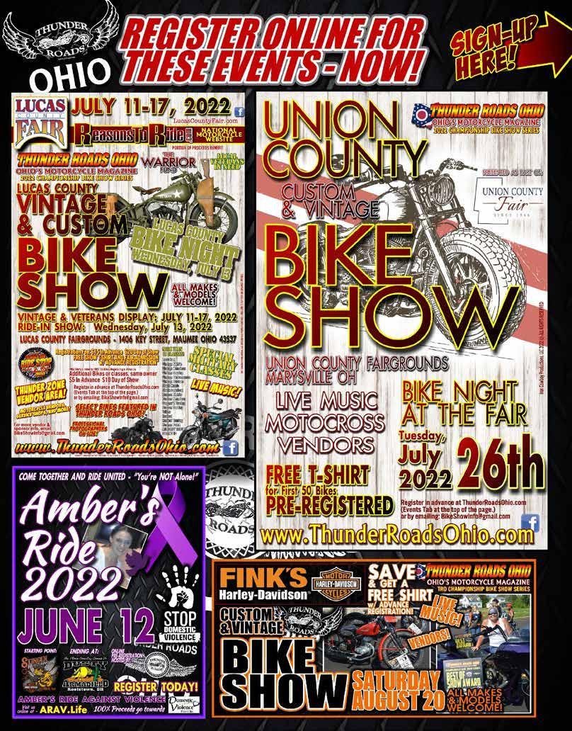 Thunder Roads Ohio will host a Customs and Classics Bike Show as a part of this year's LUCAS COUNTY FAIR at the Lucas County Fairgrounds in Maumee, Ohio. The RIDE-IN SHOW will be Wednesday, July 13, 2022 - with registration starting at 10am. As part of the Lucas County Fair, there will be THOUSANDS in attendance and PLENTY of things for those exhibiting to do. www.ThunderRoadsOhio.com ALL Makes and Models will be welcome. In addition to the Bike Show, TRO will be hosting a THUNDER ZONE vendor area showcasing motorcycle-themed vendors and exhibitors. For information on reserving space in this area, email BikeShowInfo@gmail.com Lucas County Fairgrounds 1406 Key Street, Maumee OH 43537