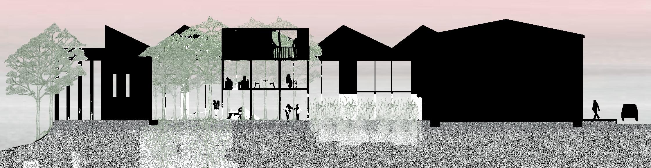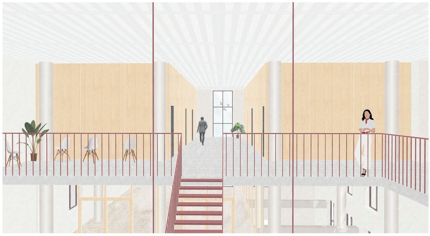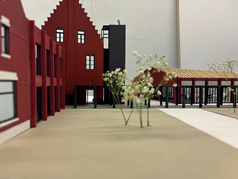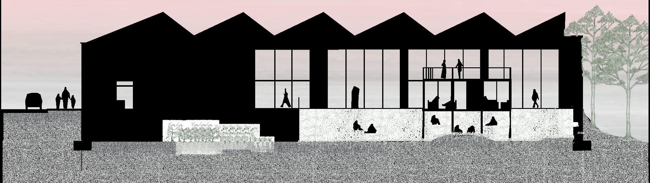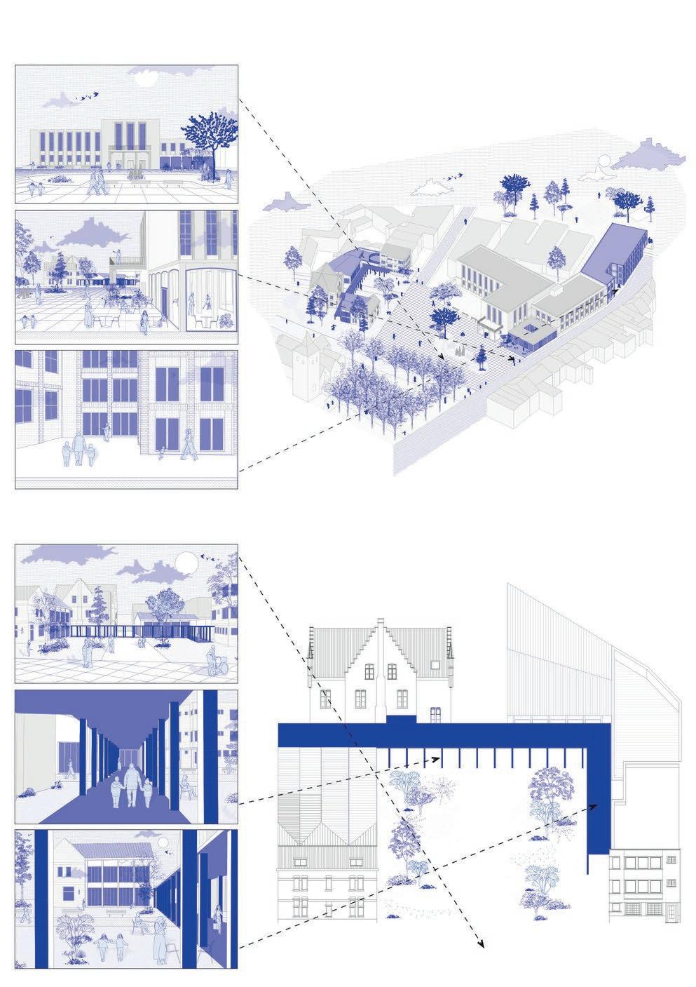 The rear facade of the social hub is transformed into a garden along the gallery. This responds to the square in front of the town hall, but also preserves the existing entrance to the centre, which already responds to an existing context with the station.