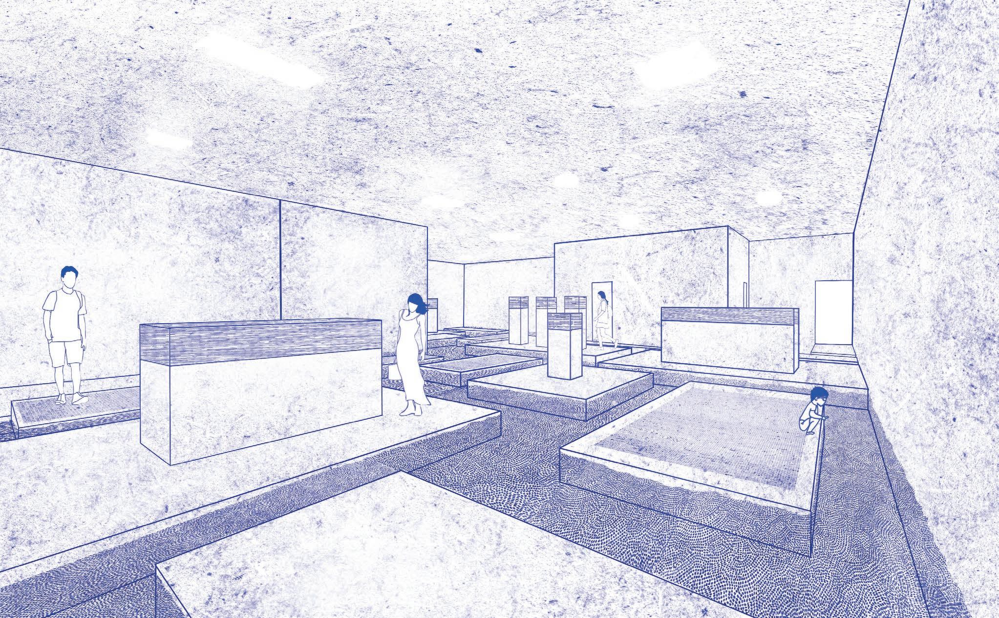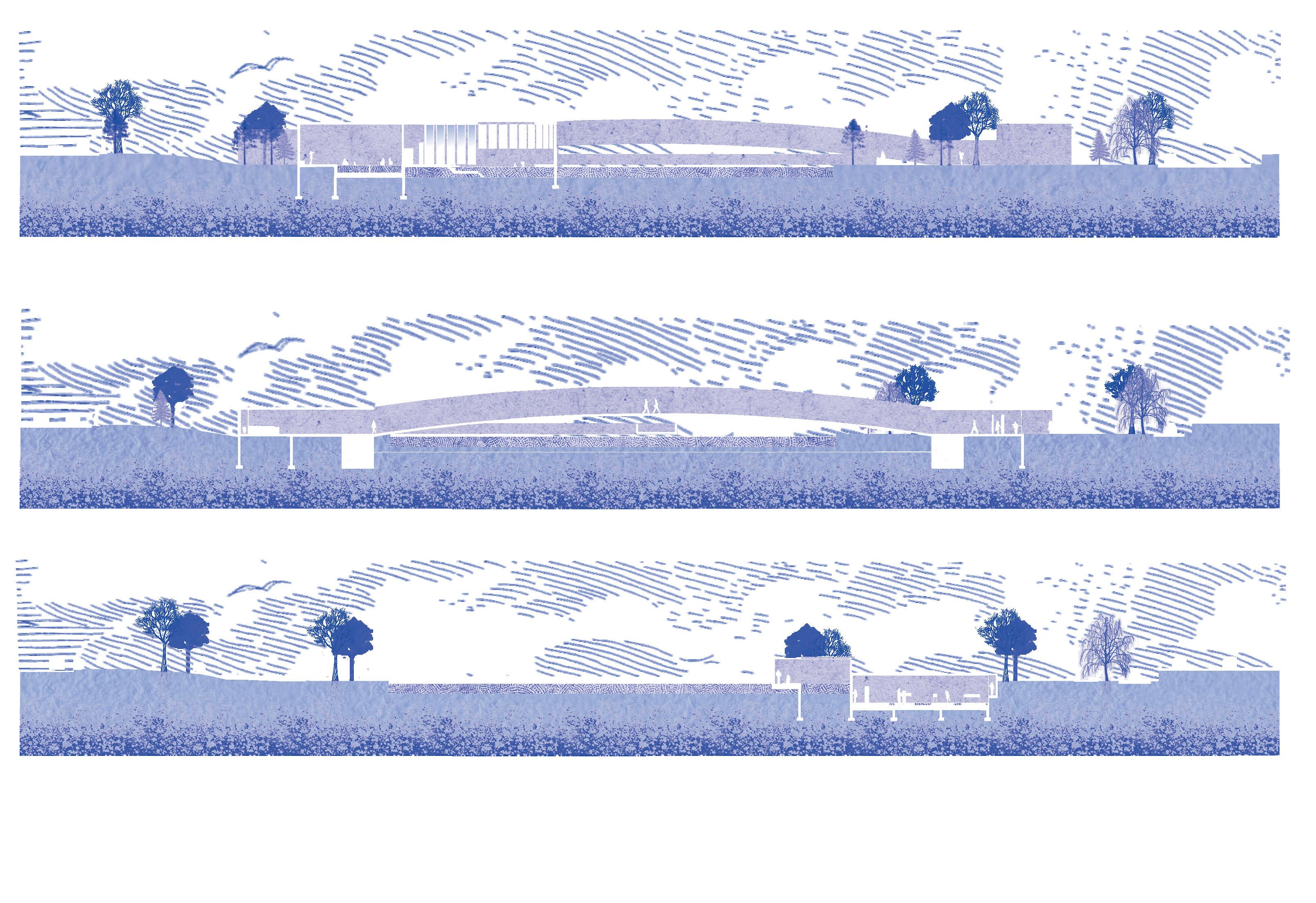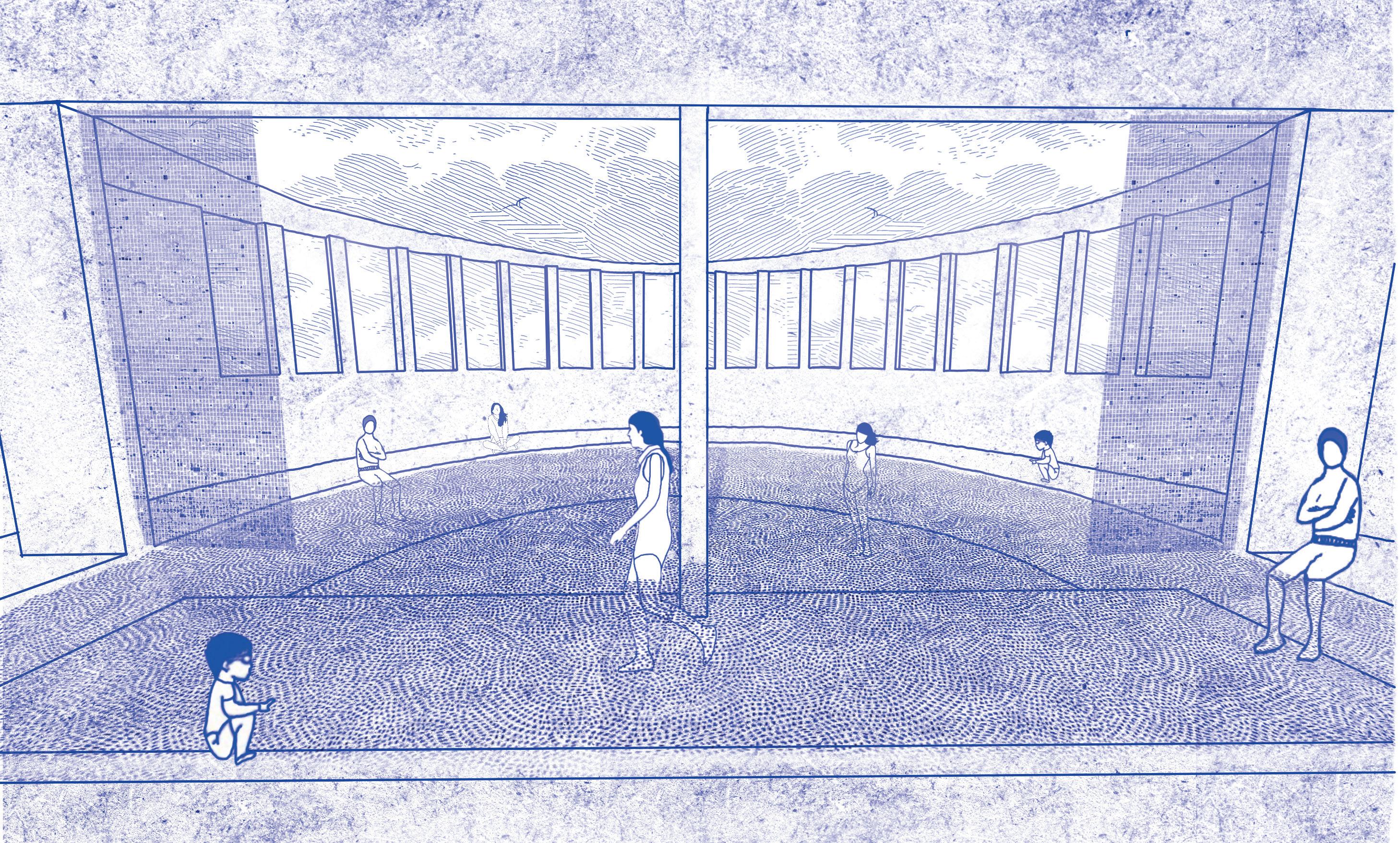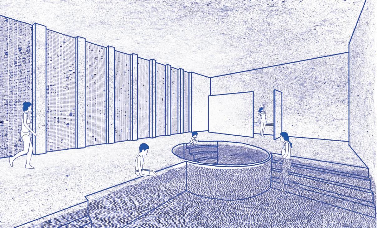 One of the two buildings contains the museum and the other the baths. The two buildings are linked by two bridges, one private and one public, linking the two banks. These two buildings are in direct contact with the water of the canal and take advantage of this to create spaces for contemplation in winter and bathing in summer, when the water level rises and fills the bathing pools. Some of the pools are accessible all year round.