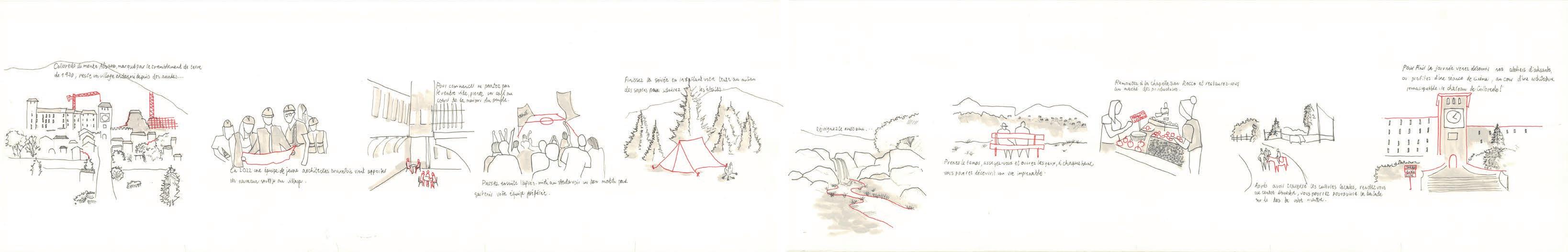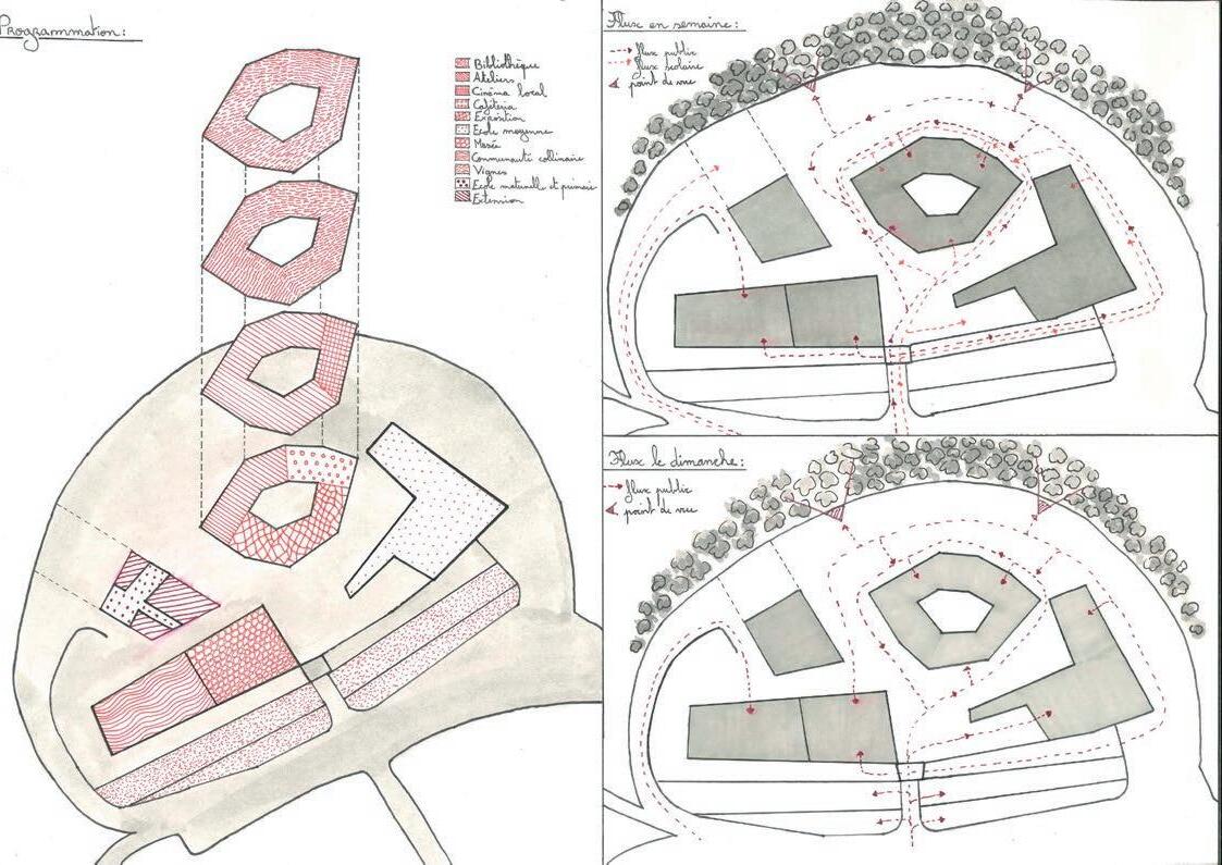 The aim of the first semester was to identify the problems and then to propose possible projects. One of the most symbolic places in the village is the castle, which stands on the highest ridge in the village. In the past, this castle was seen as a place of oppression. The village was also hit by an earthquake that destroyed a large part of it. The villagers have a very special history with this place, and are very attached to it. So change isn’t always seen in a positive light, so one of the objectives was to create a project that respected the place while responding to the challenges it faced. The project for the château in the first half of the year is essentially a re-programming to include nursery and primary schools, workshops and a museum.